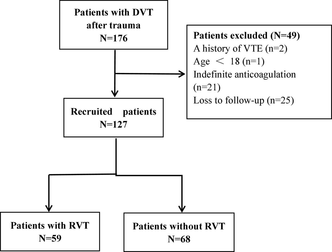 In this study, 176 patients with DVT after trauma were admitted, including 2 cases with a history of venous thromboembolism, 1 case aged <18 years, 21 cases with indefinite anticoagulation needs, and 25 cases lost to follow-up. Figure 1 shows a flow chart for selecting participants, with 127 patients eventually enrolled. The mean age of the 127 participants was 56.72 ± 15.98 years, with 81 males and 46 females. There were 25 cases of proximal thrombosis, 30 cases of mixed proximal and distal thrombosis, and the most common distal thrombosis with 72 cases. 59 (46%) of the 127 patients with remaining thrombus were in the RVT group, and 68 (54%) with complete dissolution of the thrombus were in the complete dissolution of the thrombus (NRVT) group.
