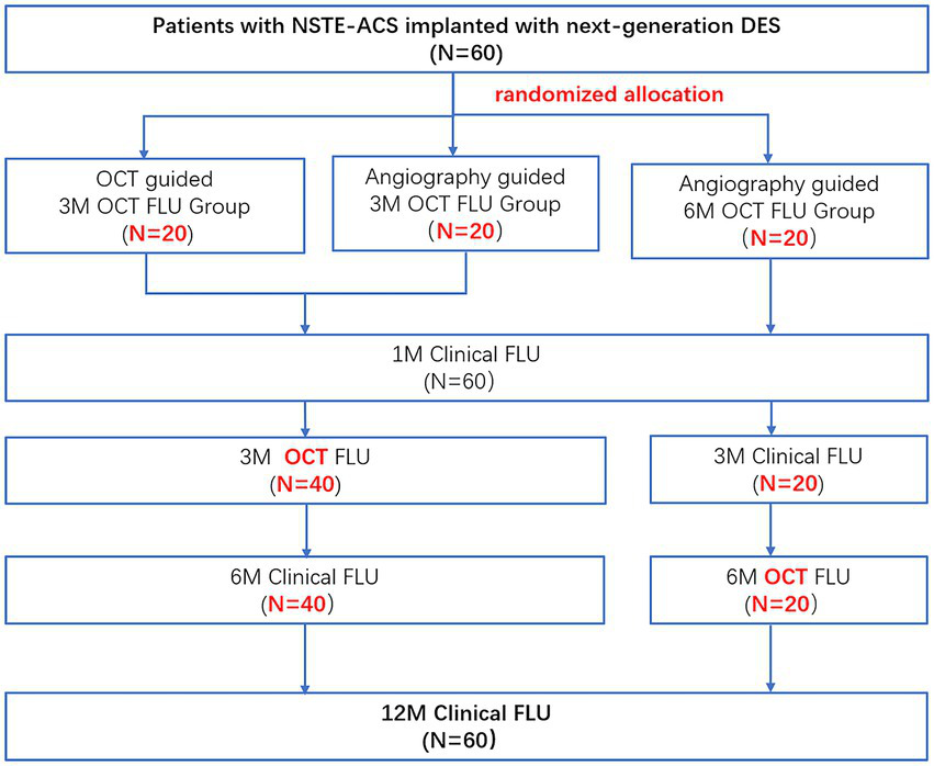 Study flow chart. NSET-ACS, non-ST elevation acute coronary syndrome; OCT, optical coherence tomography; FLU, follow up; 3 M, 3-month; 6 M, 6-month; and 12 M, 12-month.