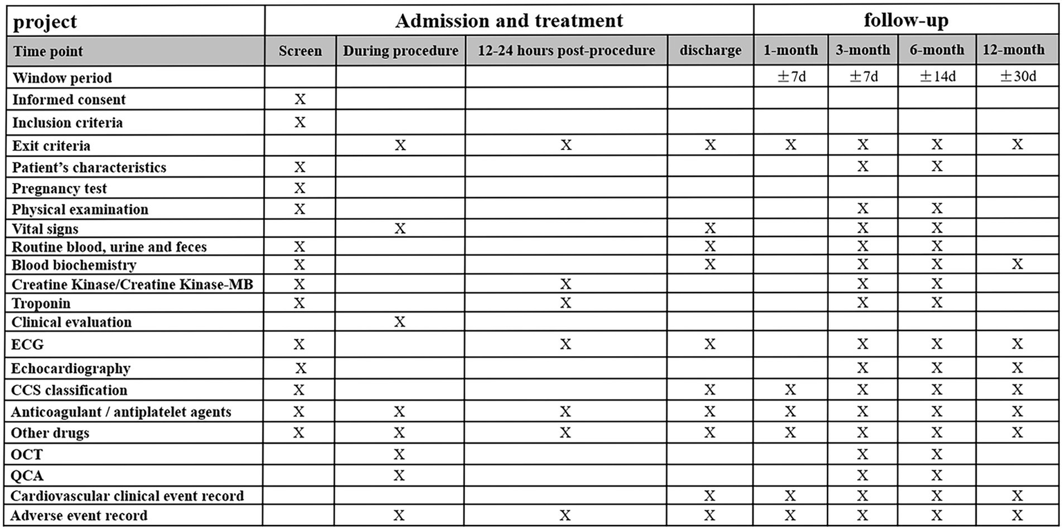 Time schedule of enrolment, interventions, and assessments of the study. ECG, electrocardiogram; CCS, Canadian cardiovascular society; OCT, optical coherence tomography; and QCA: quantitative coronary angiography.
