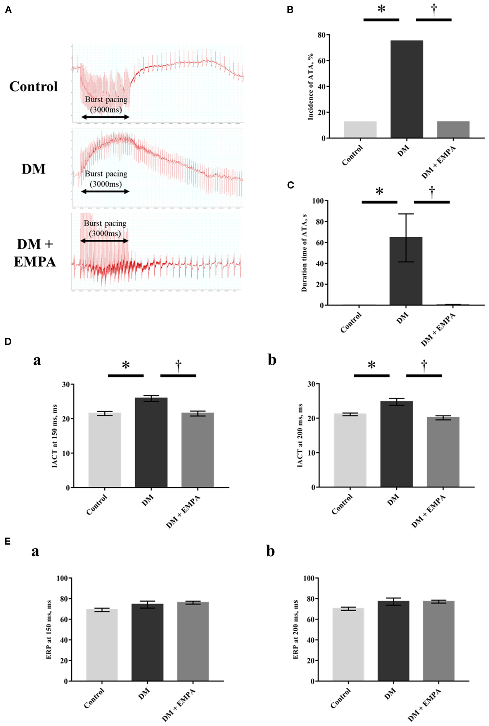 Electrophysiological study. (A) Representative electrogram traces obtained from rats in the three groups. (B) Incidence of atrial tachyarrhythmia (ATA). (C) Duration time of ATA. (D) Interatrial conduction time (IACT) at pacing cycle length of 150 ms (a) and 200 ms (b). (E) Effective refractory period (ERP) at pacing cycle length of 150 ms (a) and 200 ms (b). Data are expressed as mean ± SE (n = 8 per group). *p < 0.05: vs. Control, †p < 0.05: vs. DM (One-way repeated ANOVA with post hoc Tukey's multiple-comparison test and Fisher's exact test). DM, diabetes; EMPA, empagliflozin.