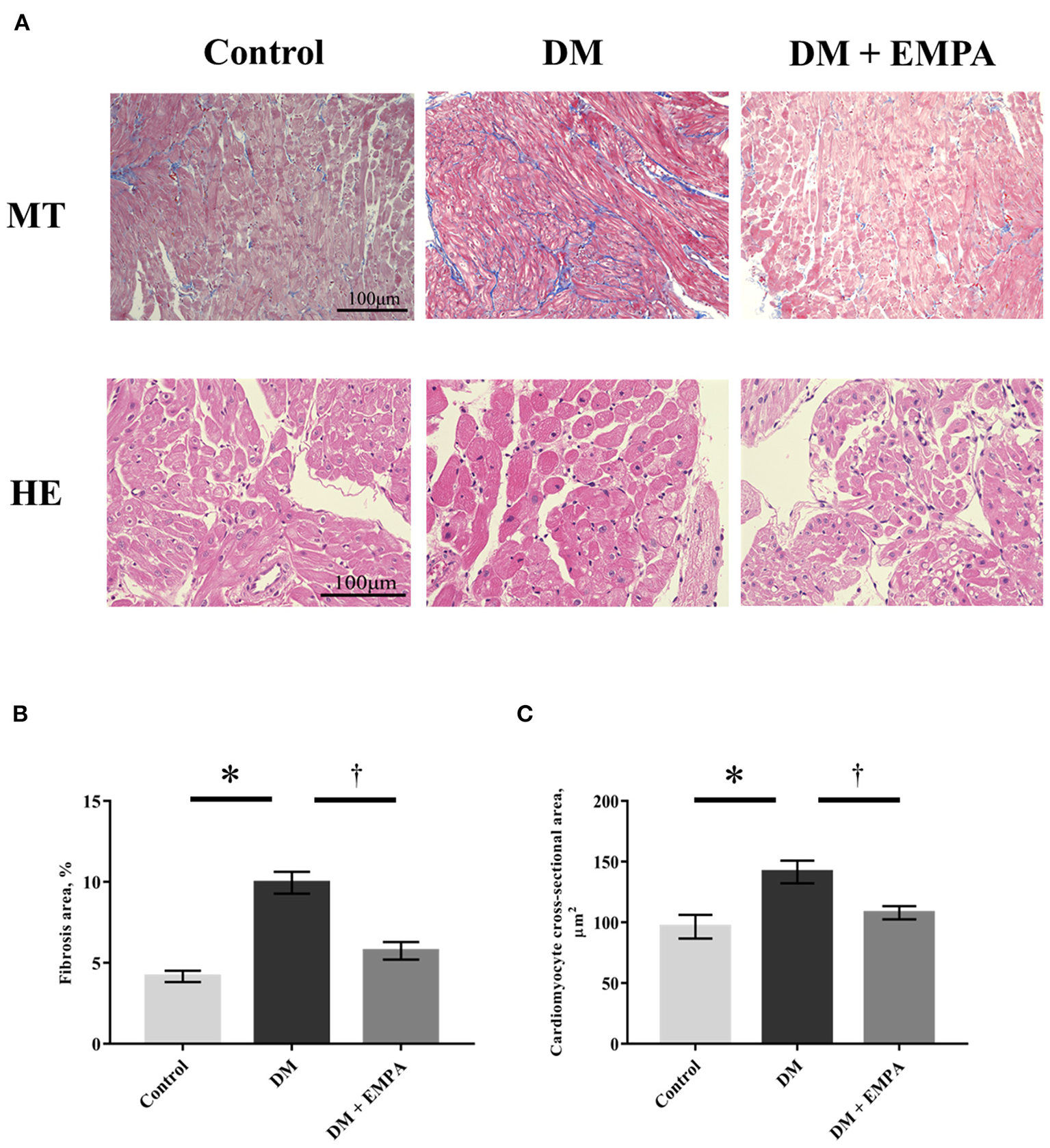 Histological study. (A) Representative images of right atrial tissue stained with Masson's trichrome (upper panels) and hematoxylin as well as eosin (bottom panels). (B) Area of fibrosis. (C) Cardiomyocyte cross-sectional area. Data are expressed as mean ± SE (n = 8 per group). *p < 0.05: vs. Control, †p < 0.05: vs. DM (One-way repeated ANOVA with post hoc Tukey's multiple-comparison test). MT, Masson's trichrome stain; HE, hematoxylin and eosin stain; DM, diabetes; EMPA, empagliflozin.