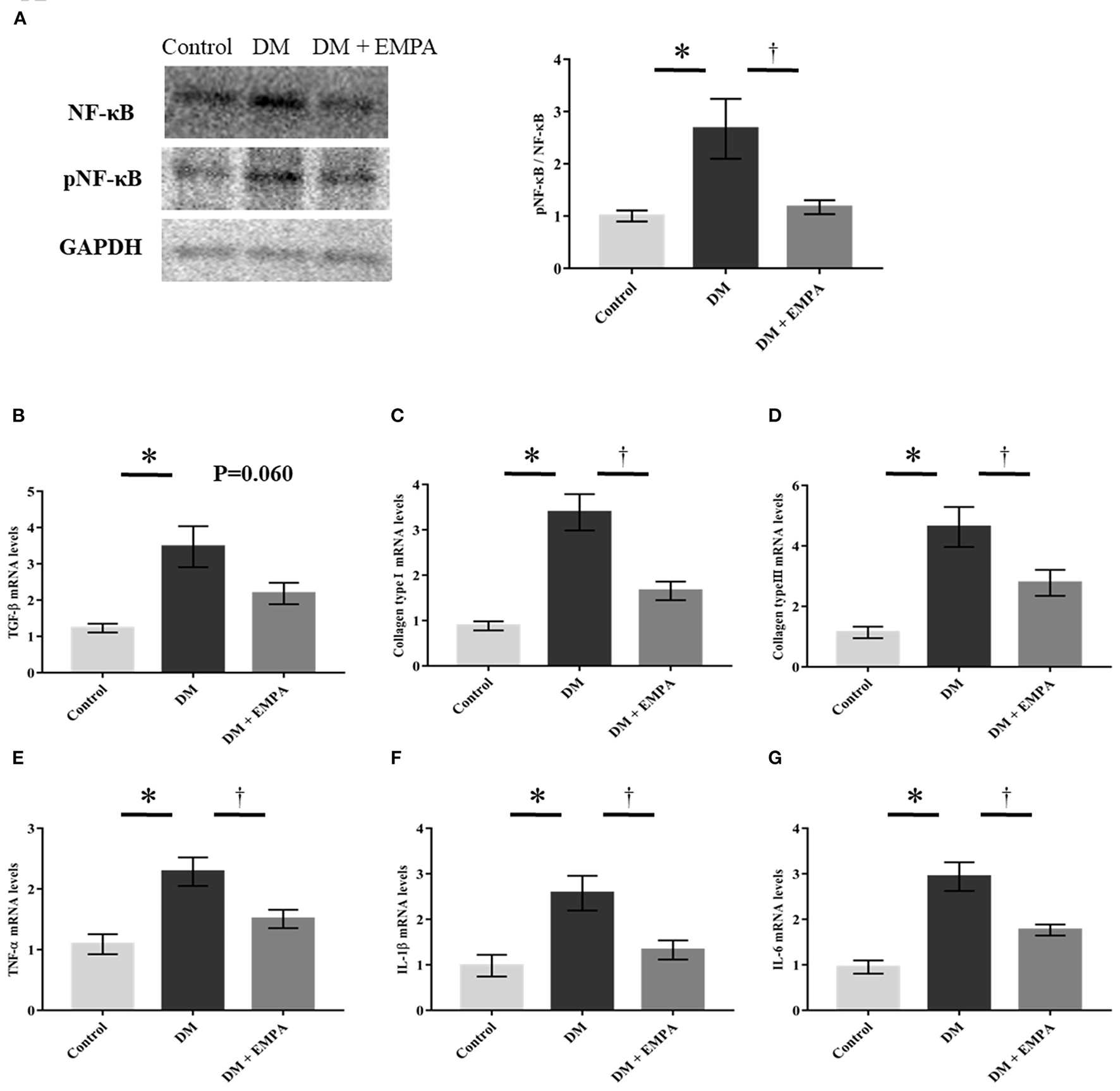 Studies on fibrotic and inflammatory signaling pathway. (A) Representative western blot results and analysis for the expression of NF-κB and phosphorylated NF-κB (pNF-κB). The value is represented as the ratio of pNF-κB to NF-κB (n = 6 per group). (B–G) Relative mRNA levels of TGF-β, collagen type I, collagen type III, TNF-α, IL-1β and IL-6 were measured by quantitative real-time RT-PCR (n = 8 per group). Data are expressed as mean ± SE. *p < 0.05: vs. Control, †p < 0.05: vs. DM (One-way repeated ANOVA post hoc Tukey's multiple-comparison test). NF-κB, nuclear factor-κB; GAPDH, glyceraldehyde 3-phosphate dehydrogenase; TGF-β, transforming growth factor-β; TNF-α, tumor necrosis factor-α; IL, interleukin; DM, diabetes; EMPA, empagliflozin.