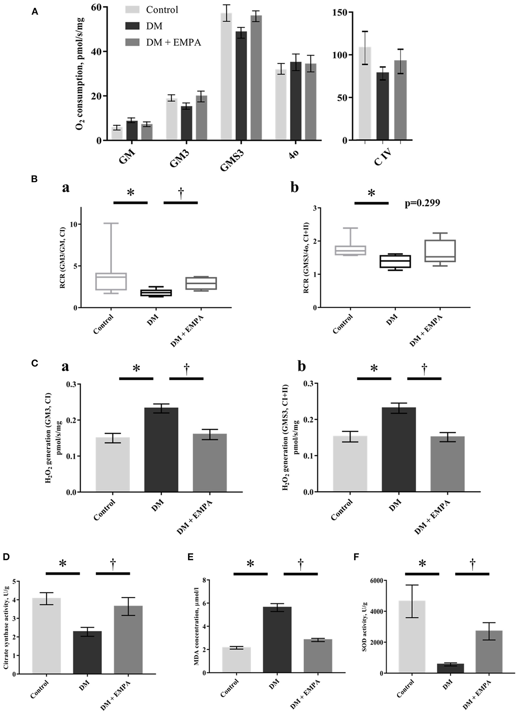 Effects of empagliflozin on mitochondrial respiratory capacity and ROS generation, as well as oxidative stress in the atrial tissue. (A) Summarized data of mitochondrial respiration during each state (n = 8 per group). (B) Respiratory control ratio (RCR) with CI-linked substrates (a) and CI+II-linked substrates (b). The line indicates median and error bars indicate the interquartile range (n = 8 per group). (C) Mitochondrial H2O2 generation with CI-linked substrates (a) and CI+II-linked substrates (b) (n = 8 per group). (D) Citrate synthase activity (n = 6 per group). (E) MDA concentration (n = 8 per group). (F) SOD activity (n = 6 per group). Data are expressed as mean ± SE or medians (interquartile range), as appropriate. *p < 0.05: vs. Control, †p < 0.05: vs. DM (One-way repeated ANOVA with post hoc Tukey's multiple-comparison test or Kruskal-Wallis test with post hoc Dunn's multiple comparison test). GM, state 2 respiration with glutamate + malate; GM3, state 3 respiration with glutamate and malate; GMS3, state 3 respiration with glutamate; malate and succinate; 4o, state 4 respiration with oligomycin; C, complex; H2O2, hydrogen peroxide; DM, diabetes; EMPA, empagliflozin.