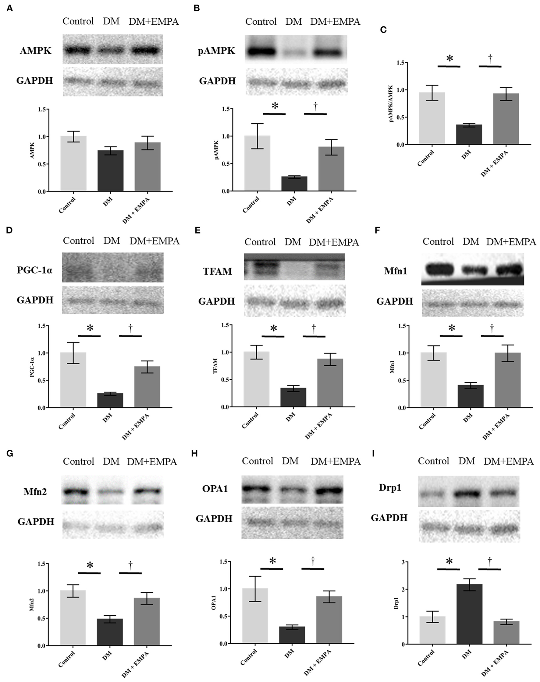 Western blotting analyses regarding mitochondrial biogenesis, fission, and fusion. (A, B, D–I) Representative western blot results and analyses for the protein expression of AMPK, phosphorylated AMPK, PGC1-α, TFAM, Mfn1, Mfn2, OPA1, and Drp1. (C) The value expressed is the ratio of pAMPK to AMPK. GAPDH was used as an endogenous control. Data are expressed as mean ± SE (n = 6 per group). *p < 0.05: vs. Control, †p < 0.05: vs. DM (One-way repeated ANOVA with post hoc Tukey's multiple-comparison test). pAMPK, phosphorylated AMP-activated protein kinase; PGC-1α, peroxisome proliferator-activated receptor γ coactivator-1α; Mfn, mitofusin; OPA1, optic atrophy 1; Drp1, dynamin-related protein 1; GAPDH, glyceraldehyde 3-phosphate dehydrogenase; DM, diabetes; EMPA, empagliflozin.