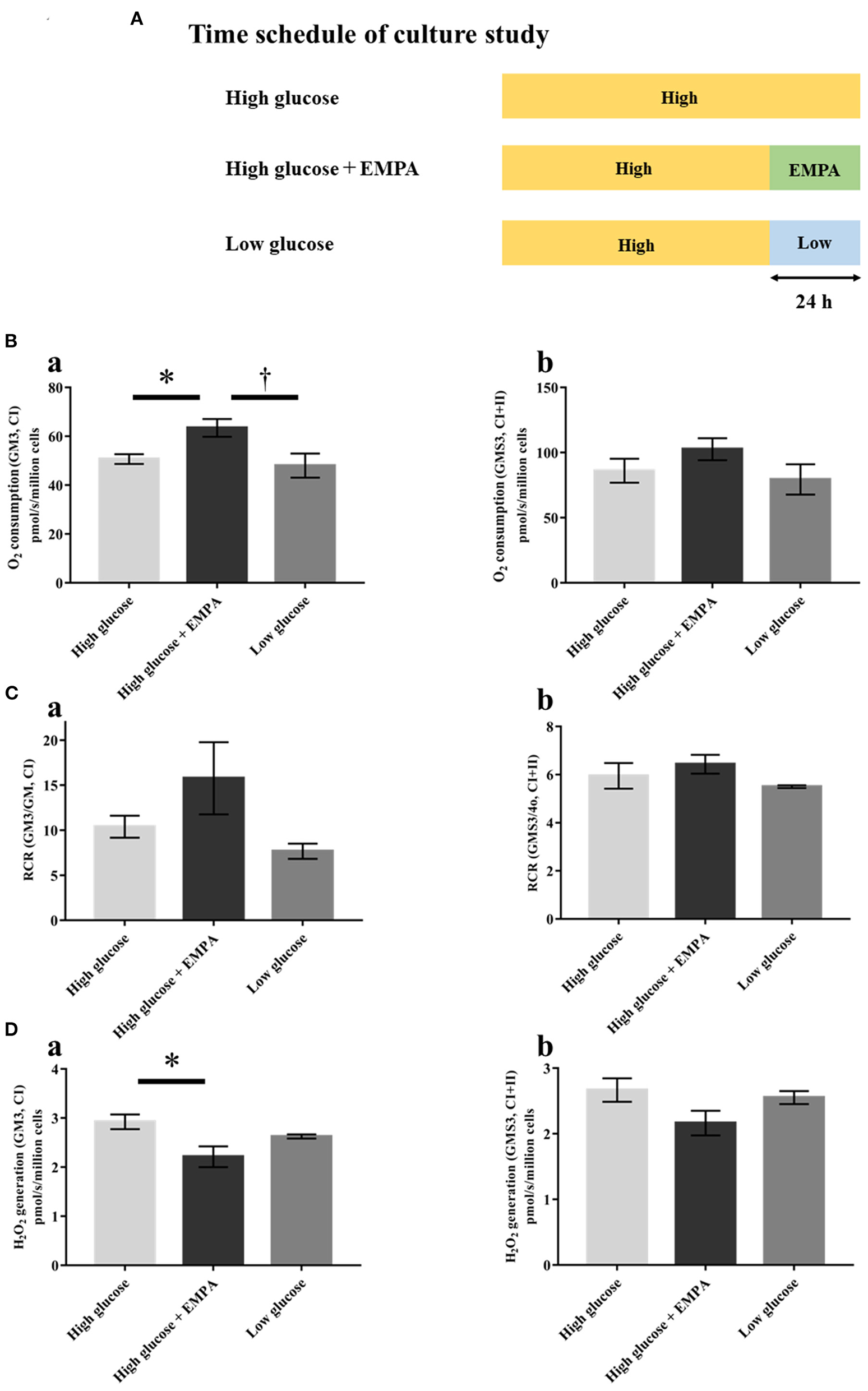 Effects of empagliflozin on mitochondrial respiratory capacity and ROS generation in H9c2 cells. (A) Time schedule of culture study [High glucose (25 mmol/l); n = 4, High glucose + EMPA (10 μmol/l); n = 3, Low glucose (2.5 mmol/l); n = 3]. (B) Mitochondrial H2O2 generation with CI-linked substrates (a) and CI+II-linked substrates (b). (C) O2 consumption with CI-linked substrates (a) and CI+II-linked substrates (b). (D) Respiratory control ratio (RCR) with CI-linked substrates (a) and CI+II-linked substrates (b). Data are expressed as mean ± SE. *p < 0.05: vs. High glucose, †p < 0.05: vs. High glucose + EMPA (One-way repeated ANOVA with post hoc Tukey's multiple-comparison test. Abbreviations are as defined in Figure 4.