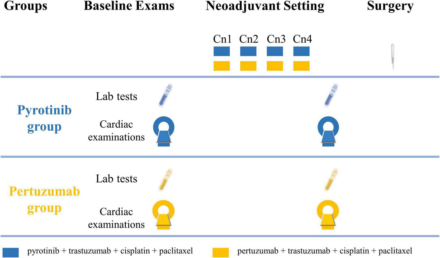 The study flowchart is shown in Figure 1. Cardiac assessments are scheduled to be conducted at baseline and before radical breast cancer surgery. Four cycles of neoadjuvant therapy will be given before radical breast cancer surgery and each cycle will last for 28 days.