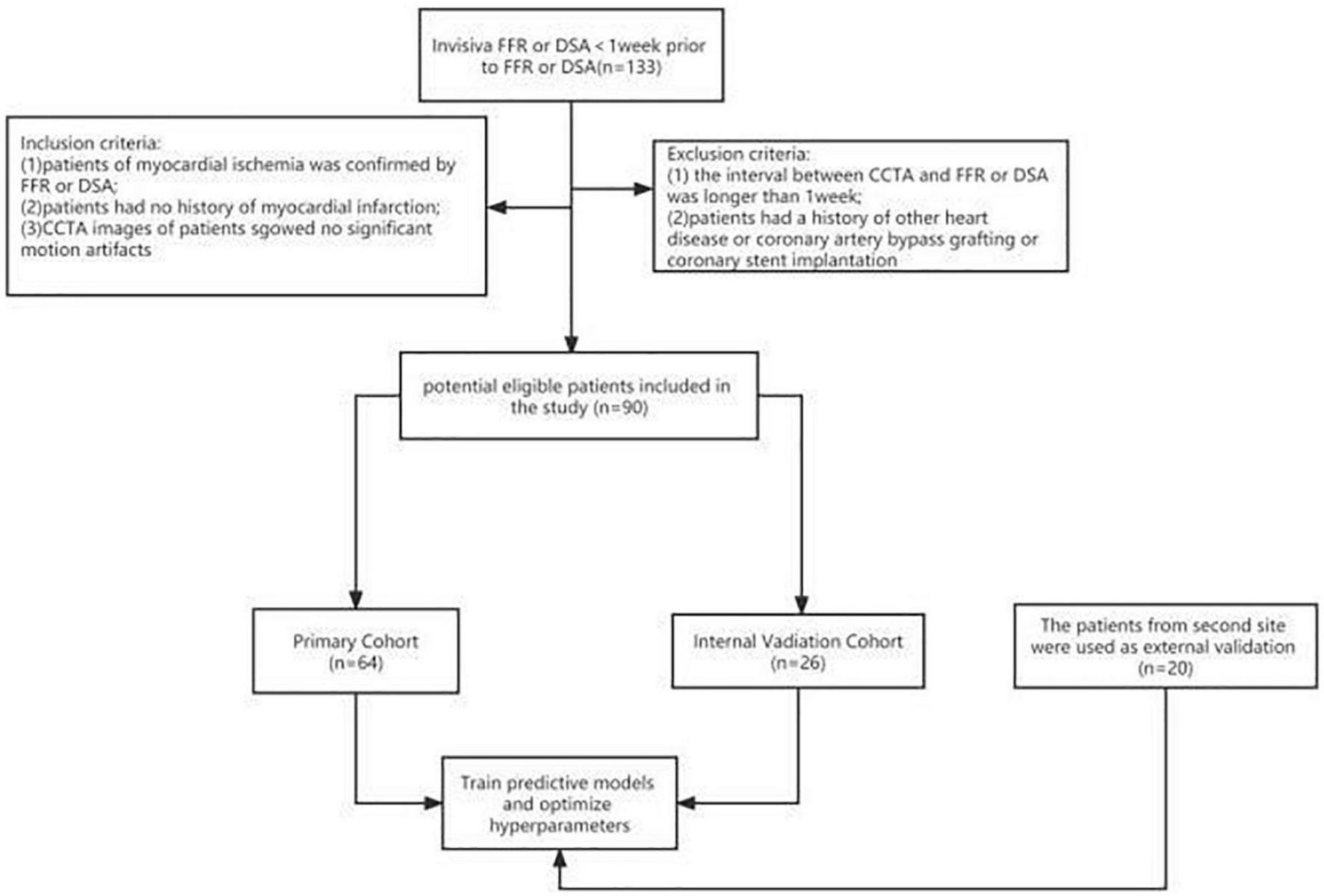 This retrospective study was approved by the Ethics Committee of Changzhou Second People’s Hospital, Nanjing Medical University. The inclusion criteria for patients were as follows: (i) patients with myocardial ischemia were confirmed by FFR ≤ 0.8 or DSA ≥ 90%; (ii) patients had no history of myocardial infarction; and (iii) CCTA images of patients showed no significant motion artifacts. The exclusion criteria were as follows: (i) the interval between CCTA and FFR or DSA was longer than 1 week; and (ii) patients had a history of other cardiac diseases or coronary artery bypass grafting or coronary stent implantation. Ultimately, 110 patients were enrolled from 2 sites in the study. The process of patient selection is illustrated in Figure 1.