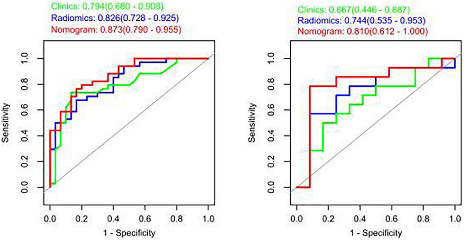 The model constructed by the selected eight radiomics features exhibited good discrimination ability, with AUC values of 0.826, 0.744 in the training and internal validation sets, respectively (Figure 5). The accuracy, sensitivity, and specificity of this model are presented in Table 4.