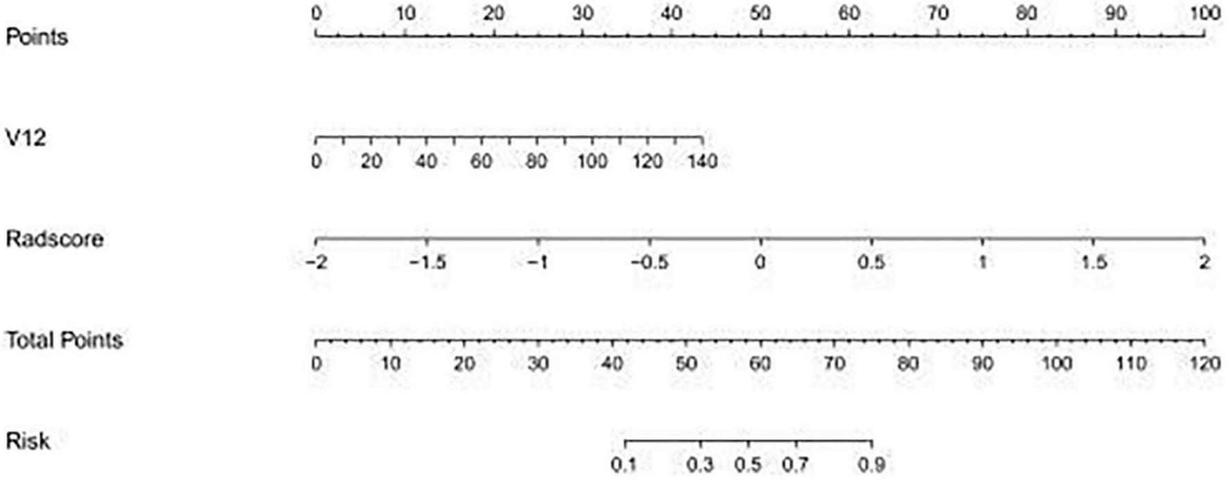 The established clinical-radiomic nomogram for predicting myocardial ischemia. V12, Gensini score.