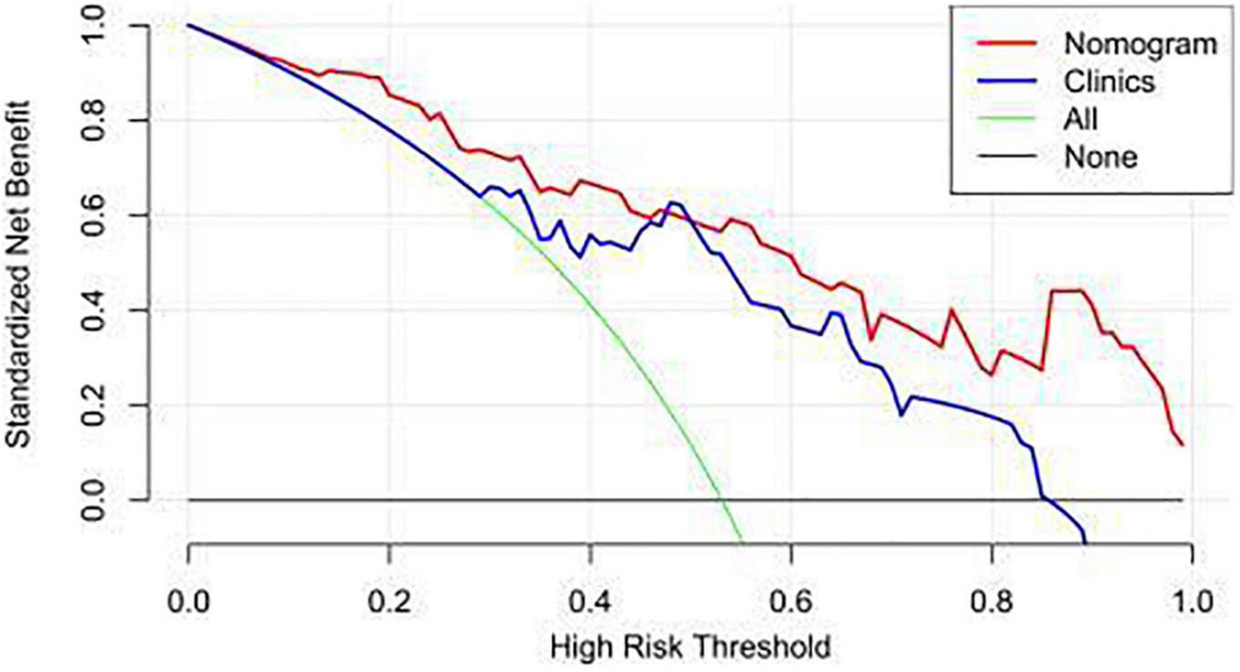 Radiomics is a method of transforming images to generate high-throughput data that can be mined. It has shown excellent performance in predicting the diagnosis, prognosis, staging, and treatment responses of cancer patients (24, 25). In this study, a predictive model was established based on CCTA radiomics. The AUC, sensitivity, specificity, accuracy, positive predictive, and negative predictive values of the model for predicting myocardial ischemia implying that the model has good diagnostic performance. To further enhance the performance of the model, this study combined clinical risk factors and radiomic features to establish a prediction model.