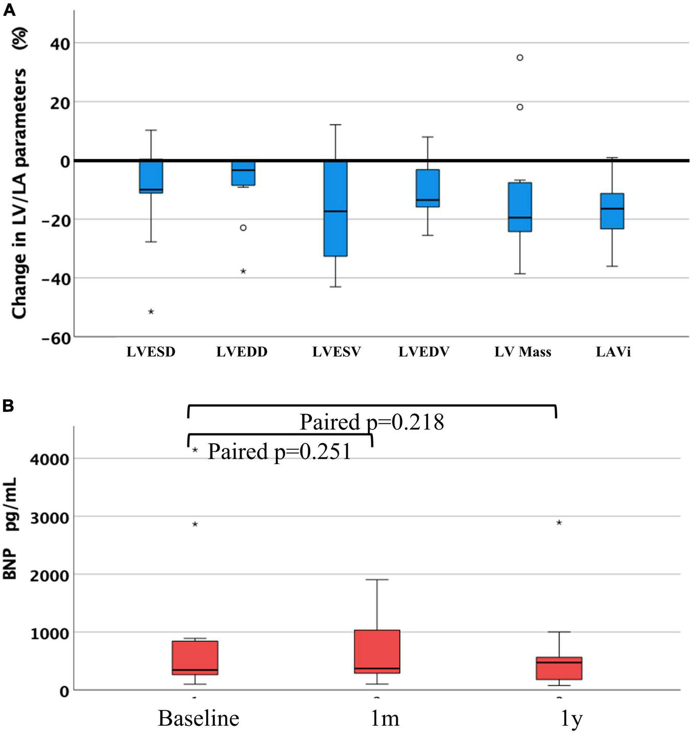 We evaluated all-cause mortality for all patients based on the entries in patients’ records and data reconciliation with the Rhineland-Palatinate bureau of vital statistics up to January 1st, 2022. In patients with complete TTE follow-up, we also evaluated the change of New York Heart Association functional class (NYHA) and the change of BNP to assess heart failure, while reverse remodeling of left cardiac chambers was investigated by observing the change in LVEDD, LVESD, LVEDV, LVESV, LV mass, and LAV index, respectively. Data at around 1 month (30d) and at around 1 year (1Y) after the procedure were compared to baseline values.