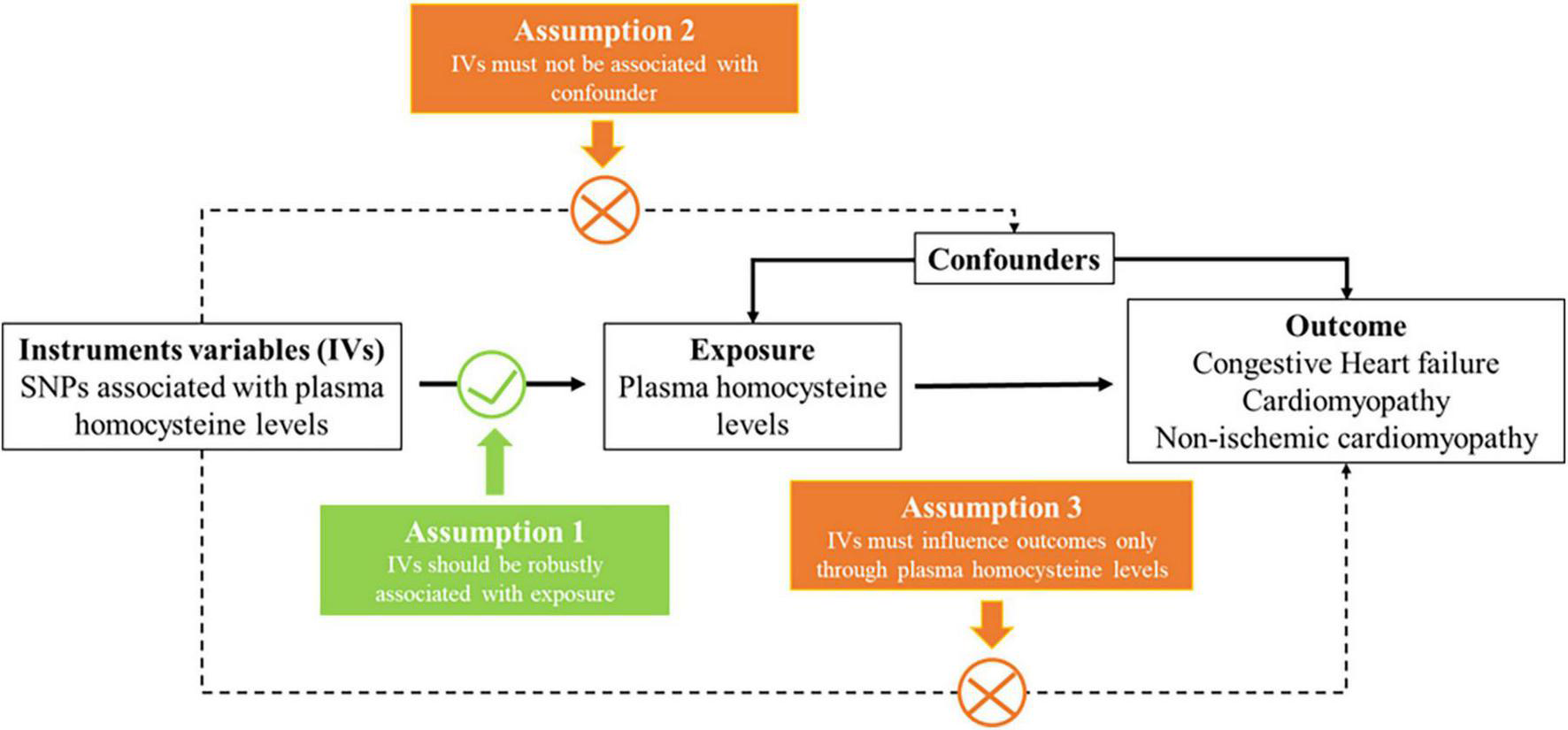 We designed a two-sample MR (TSMR) analysis to evaluate the causal effect of plasma homocysteine on diseases. The MR approach seeks IVs based on three principal assumptions (Figure 1; 18). First, IVs are strongly associated with the risk factor of the exposure (homocysteine). Second, IVs should not be associated with confounders. Finally, IVs only affect the outcomes (congestive heart failure, cardiomyopathy or non-ischemic cardiomyopathy) through the homocysteine pathway and not other pathways.