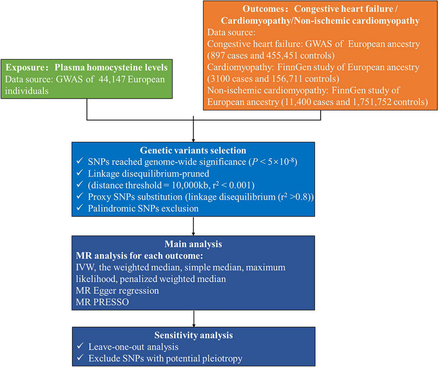 We accessed the publicly available genome-wide association study (GWAS) summary statistics provided by the NHGRI-EBI GWAS Catalog1 or the Integrative Epidemiology Unit GWAS database.2 The exposure in this study was genetically predicted plasma homocysteine levels. We selected genetic variants associated with plasma homocysteine levels in a meta-analysis that included data from ten independent cohorts of European ancestry, with up to 44,147 individuals (19). Genetic variants associated with congestive heart failure were obtained from the most extensive published GWAS which contained 897 congestive heart failure cases and 455,451 controls in the GWAS Catalog (20). We selected GWAS summary statistics from the FinnGen cohort on the Integrative Epidemiology Unit Open GWAS Project database for cardiomyopathy and non-ischemic cardiomyopathy. The FinnGen study includes an expanding repository of genomic and clinical data emanating from a nationwide network of Finnish biobanks.3 For cardiomyopathy, we used the GWAS with the specific ID “finn-b-I9_CARDMYO” consisting of 3,100 cases, 156,711 controls and 16,380,196 genotyped single-nucleotide polymorphisms (SNPs). Publicly available data for non-ischemic cardiomyopathy were available from a GWAS with the specific ID “finn-b-I9_NONISCHCARDMYOP,” involving 11,400 cases and 175,752 controls. There was no overlap between the participants included in the GWAS for homocysteine and these outcomes. The datasets used in MR analysis include individuals of European ancestry to reduce selection bias and improve the robustness. The analytical procedure is shown in Figure 2.