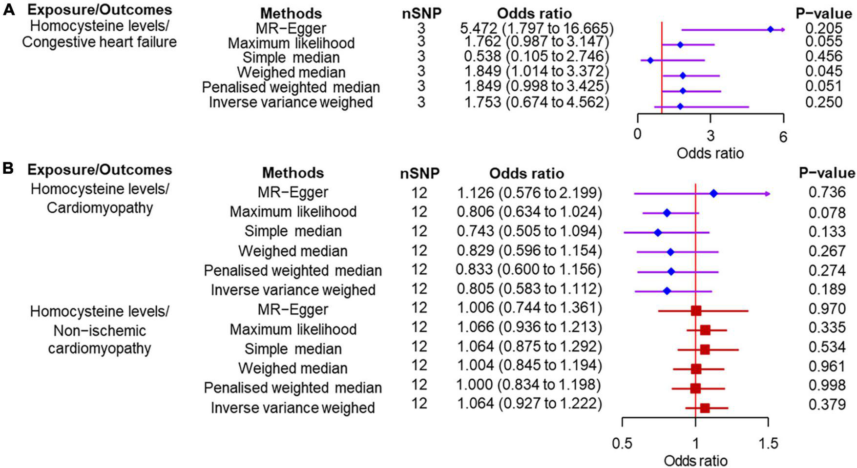 Studies suggested that elevated plasma homocysteine levels were associated with an increased risk of other CVD, including coronary heart disease (53), hypertension (54), atrial fibrillation (55), and stroke (56). Nevertheless, like our study, several MR studies failed to identify a causal relationship between elevated plasma homocysteine and CVD. Sun et al. performed an MR study suggesting plasma homocysteine levels were not causally associated with atrial fibrillation (24). Miao et al. conducted a TSMR study estimating the role of increased plasma homocysteine levels on the etiology of coronary heart disease and acute myocardial infarction and found no causal relationship (57). Borges et al. performed an MR analysis to assess the causal influence of homocysteine on systolic and diastolic blood pressure, and the findings did not corroborate the hypothesis that homocysteine has a causal role in blood pressure (58). Another MR analysis indicated that circulating total homocysteine was associated with small vessel stroke but not with other subtypes such as large artery stroke and cardioembolic stroke (59). Regarding the association between homocysteine and heart failure, the results are compelling. Consistent with our findings, an MR analysis that evaluated the association between genetically predicted homocysteine, vitamin B12 levels, and indistinguishable types of heart failure also showed negative results (60). Strauss et al. used MR to examine the associations of the methylene tetrahydrofolate gene and paraoxonase 1 gene variants as a proxy for lifelong exposure to high homocysteine and homocysteine-thiolactone concentrations with the development of heart failure in men aged ≤ 60 years, providing evidence that hyperhomocysteinemia is a causal factor for non-ischemic heart failure in dilated cardiomyopathy (61). Facing the results of lacking causality, there are several possible explanations. The association of homocysteine and congestive heart failure or cardiomyopathy, even CVD, shown in observed studies may result from confounding factors. Although these studies adjusted for some confounders, it is impossible to control unmeasured risk factors completely. In MR analysis, unmeasured confounding factors were equally distributed between the exposure and control groups to avoid the influence of possible confounding factors. The sample size might not be large enough in traditional observational studies to detect the exact association. The side effects of elevated homocysteine levels on CVD may be due not to homocysteine itself but to the downstream products of homocysteine metabolism. Moreover, the elevated plasma homocysteine may be a consequence of CVD. Aksoy et al. proposed a hypothesis that a diminished clearance rate caused by impaired renal function was a prominent pathophysiological mechanism in the elevation of homocysteine concentration in heart failure (62). Finally, we should recognize that research on the role of hyperhomocysteinemia in the occurrence and progression of heart failure should be performed under specific etiologic scenarios.