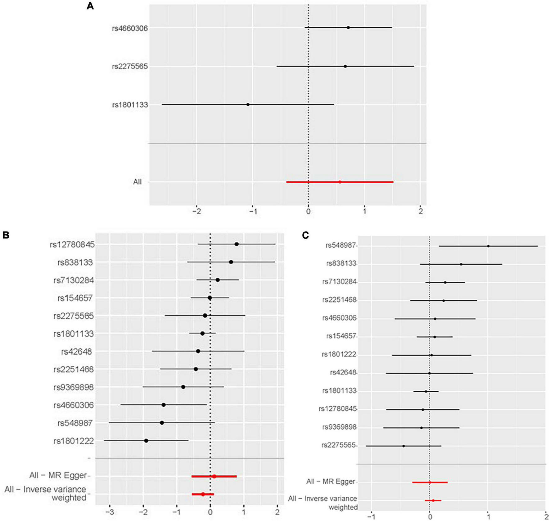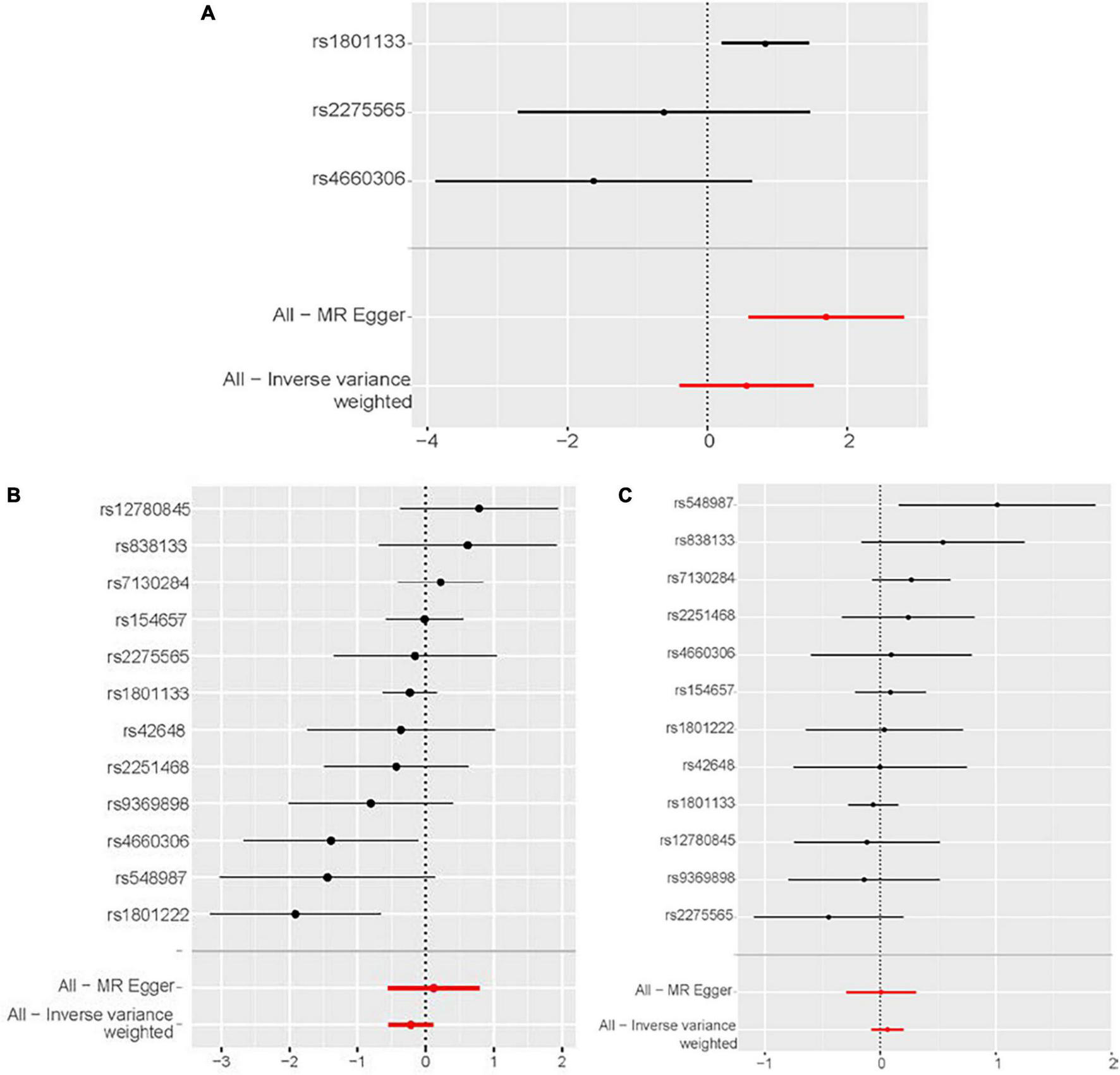 Forest plot of the potential effects of plasma homocysteine level–associated SNPs on outcomes. (A) Congestive heart failure. (B) Cardiomyopathy. (C) Non-ischemic cardiomyopathy. CI, confidence interval; IVW, inverse variance-weighted; MR, Mendelian randomization.
