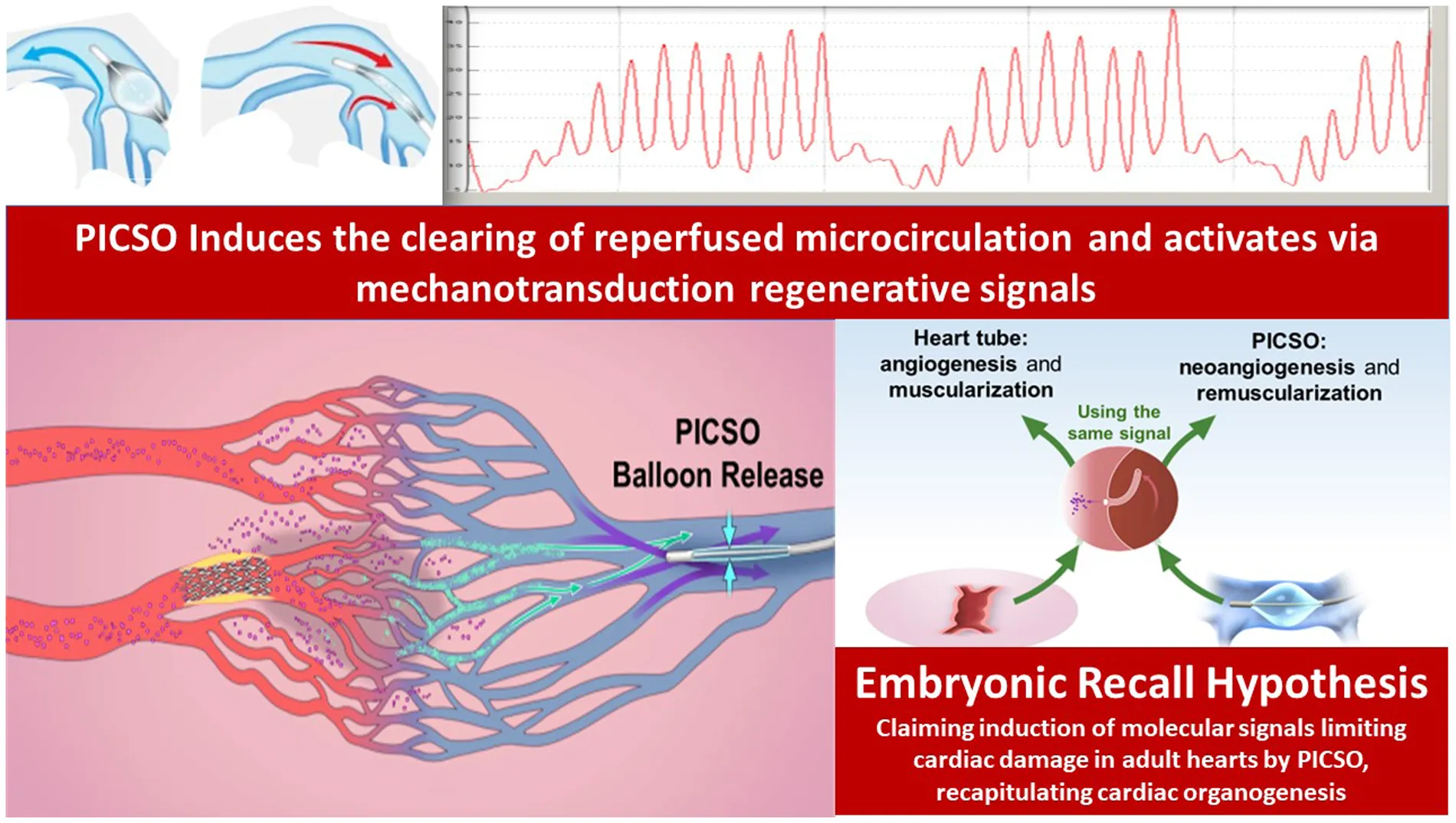Treatment of microcirculation dysfunction and the initiation of developmental regenerative pathways using the mechanochemical feedback loop according to our hypothesis of “embryonic recall.” Mechanochemical process: PICSO uses the same canonical pathways as the early embryo shortly after the heart tube starts beating. Sensing this “mechanical event” triggers mechanochemical signaling progressing heart organogenesis. Likewise, PICSO uses the same “mechanical signal initiation” principles in the failing adult heart and influences via the same non-coding RNA (143/145 flow-sensitive miRNAs) epigenetic landscaping, building new vessels, and revascularizing failing hearts. Illustration of the principles of the “Embryonic Recall” hypothesis. During balloon occlusion, blood is forced into the microcirculation, and plasma is separated at the significant branches leaving a higher hematocrit in the coronary veins. Plasma enters the microcirculation. This “plasma skimming” process initiates the secretome-generating PICSO machinery. During the opening of the balloon occlusion, forward flow empties the microcirculation, and repetitive cycles induce washout. There are three hypothetical sources of molecular signals. (A) Separation of plasma and degranulation of platelets at branching points. (B) Venous cilia bend in the retrograde flow and activate the cytoskeleton inducing the mechanochemical feedback loop. (C) Pericytes are stretched by radial forces of retroflowing plasma. PICSO, pressure-controlled intermittent coronary sinus occlusion.