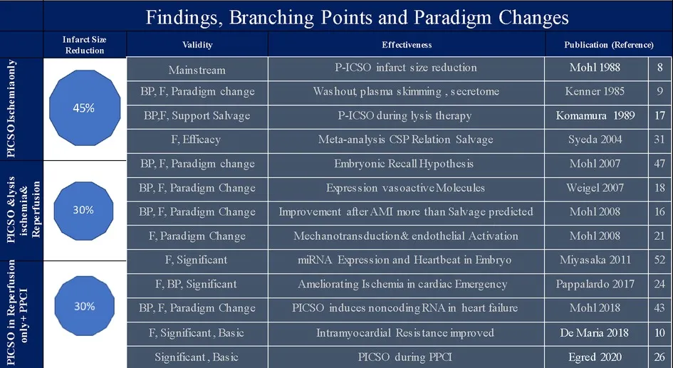 Table 1 depicts a description of mainstream PICSO research and paradigm changes. Figure 1 illustrates the PICSO principles. Myocardial salvage was the focus of early PICSO research and was first formulated in the pre-revascularization period. However, unexpected experimental and clinical findings followed and suggested additional beneficial molecular effects besides salvage, representing another essential branching point warranting a focus change (16). The first step toward a paradigm shift became necessary when evaluating long-term results using lysis therapy with and without PICSO in a historical Japanese study first described by Komamura in 1989, showing a 30% reduction of infarct size (16, 17). In 2008, we re-analyzed the long-term outcome of the patients studied by Komamura in 1980s. The series of patients treated with PICSO in Japan showed an impressive risk reduction in restenosis and major adverse cardiac events (MACE), outnumbering the 30% reduction of infarct size (16).