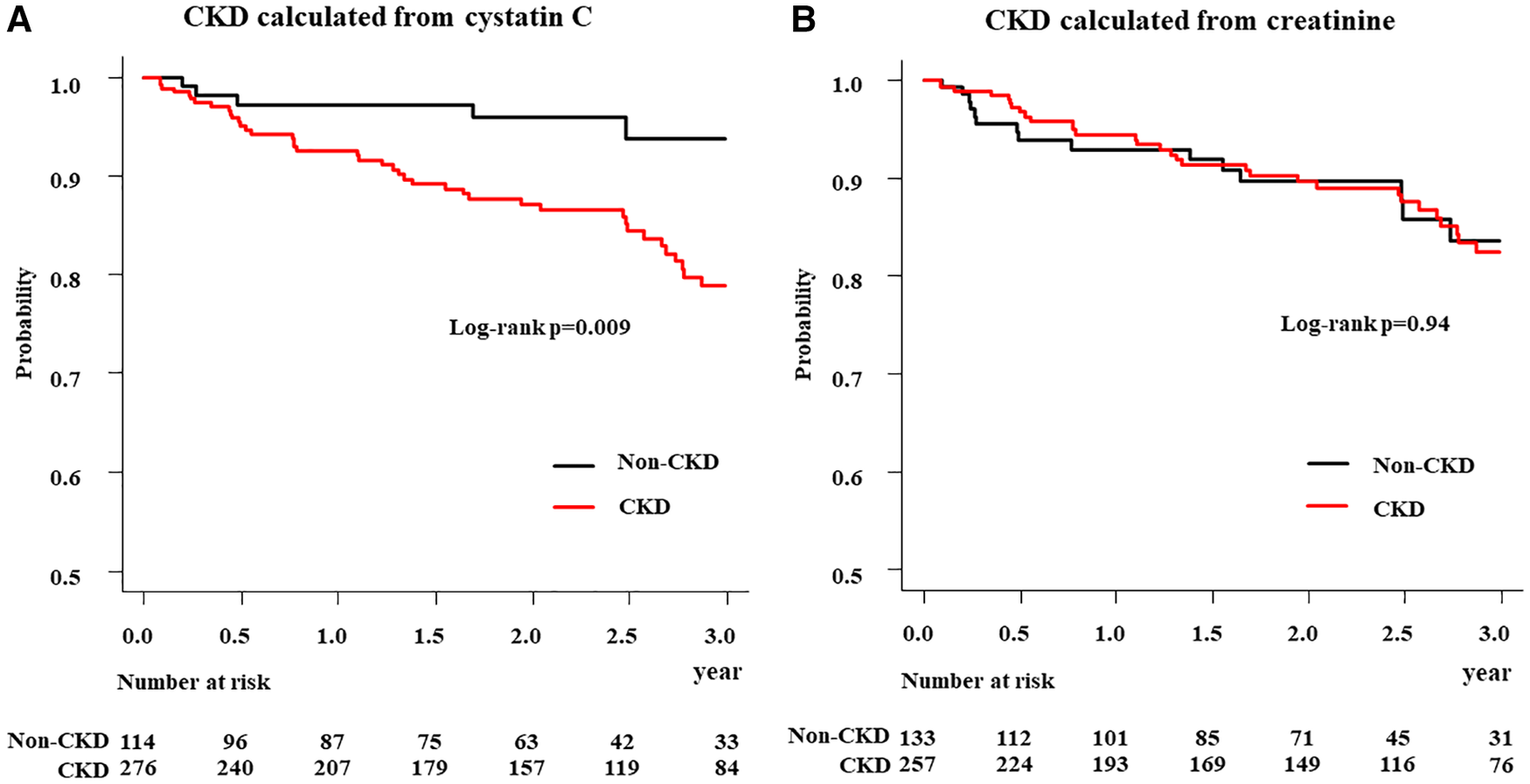 This study included 390 consecutive patients with symptomatic severe aortic stenosis (AS) who underwent TAVI, and measured cystatin C-based eGFR at discharge. Patients were divided into two groups, with or without CKD estimated with eGFR (cystatin C). The primary endpoint of this study was the 3-year all-cause mortality after TAVI.