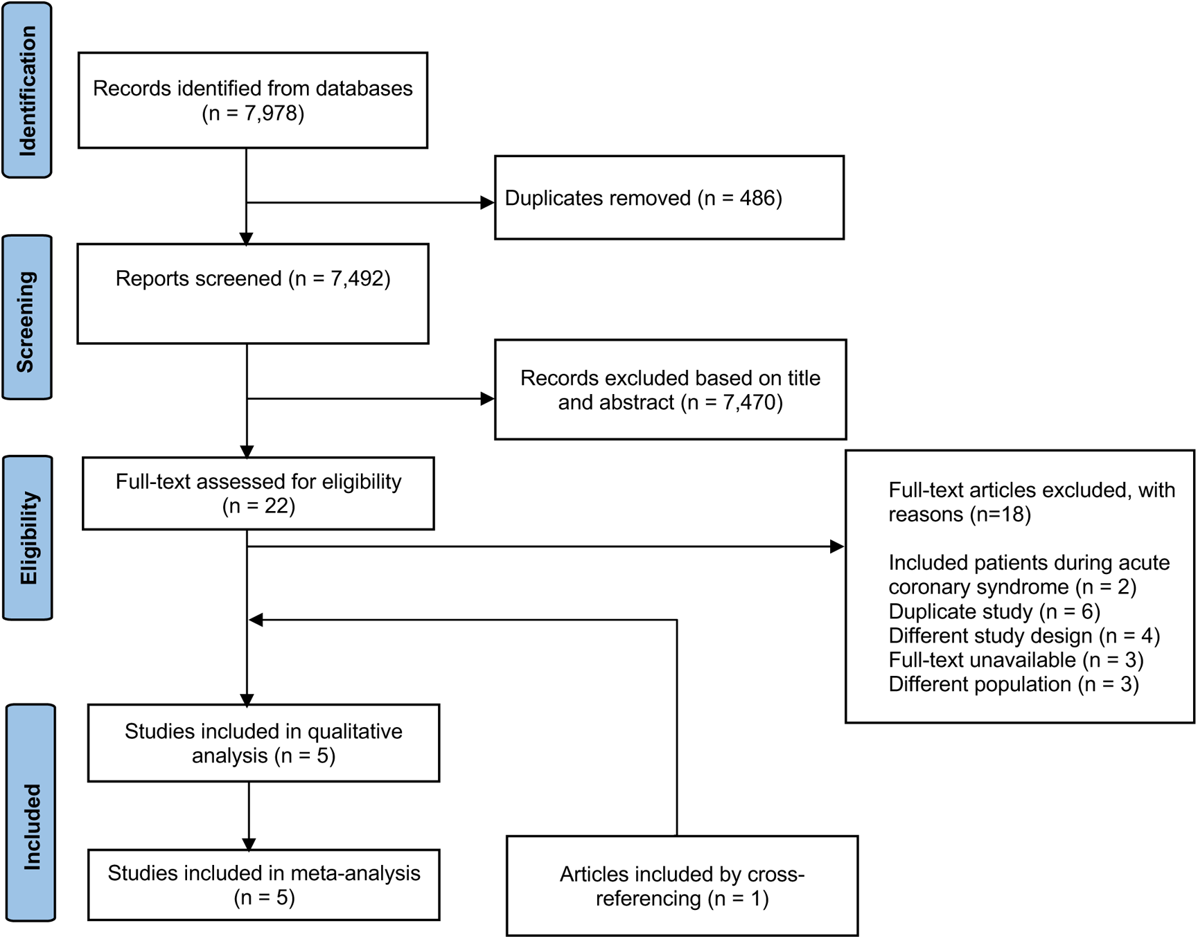 The search strategy identified 7,978 citations, including 7,492 unique reports. Twenty-two full-text articles were retrieved after excluding 7,470 reports (Figure 1). Five RCTs comprising 80,605 patients were included in the review and meta-analyses. Seven different antithrombotic regimens were identified: ASA, ASA + prasugrel 10 mg, ASA + rivoroxaban 2.5 mg, ASA + clopidogrel 75 mg, clopidogrel 75 mg, ASA + ticagrelor, and rivaroxaban 5 mg.