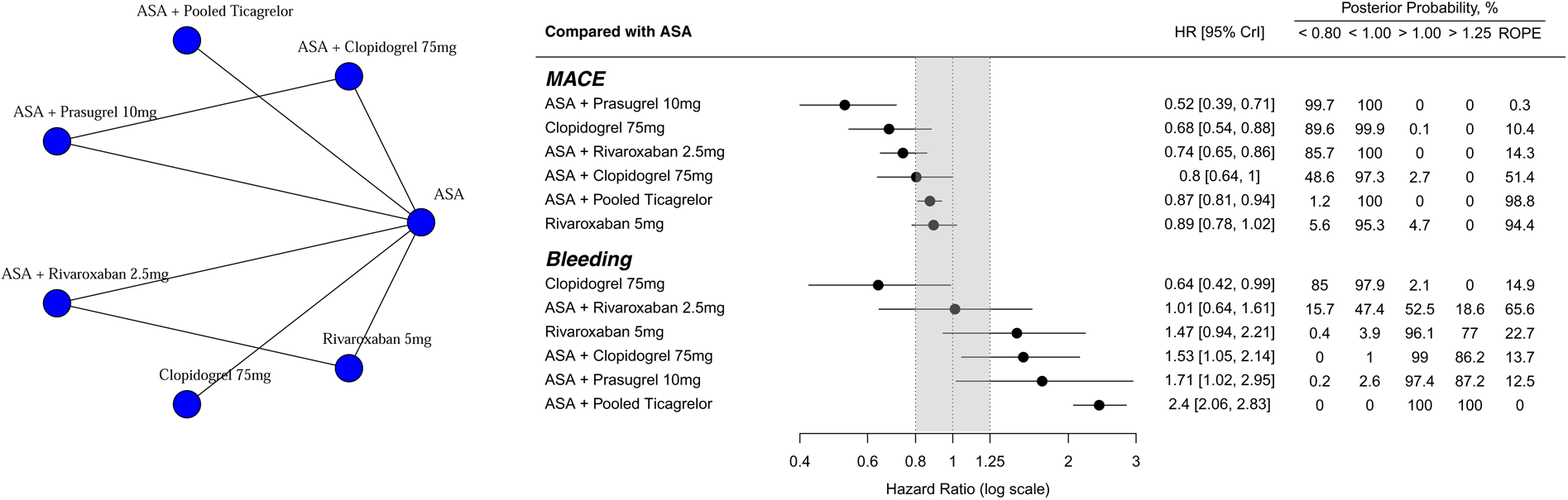 Network plot. Treatment effects compared with ASA on MACE and Bleeding outcomes, ordered according to underlying SUCRA values. HR below 1.0 favors the experimental treatment. On the left, treatment names are depicted. In the middle, forest plot shows each treatment effect median and 95% credible intervals. Gray area corresponds to the ROPE (from 0.8 to 1.25 HR). On the right, exact effect sizes along with posterior probabilities are shown. ROPE, region of practical equivalence; HR, hazard ratio.