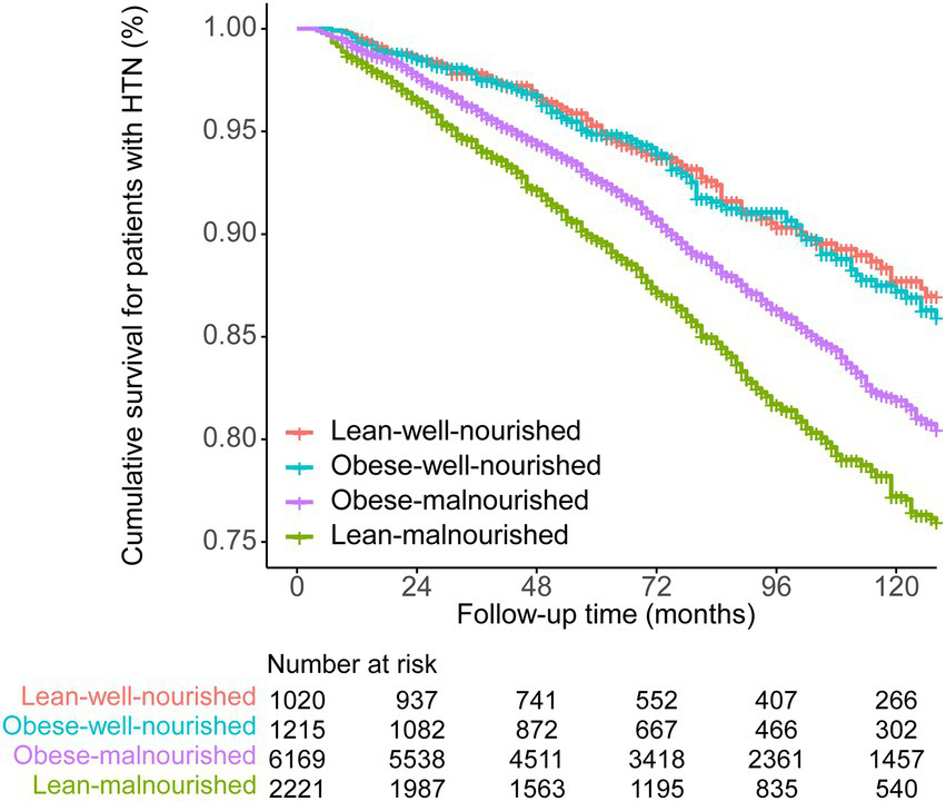 A total of 28,554 participants with 10,625 hypertension patients were included in the analysis. The lean-malnourished group showed a lower hypertension risk (odds ratio [OR] 0.85, 95% confidence interval [CI]: 0.77–0.94), while the obese-well-nourished condition elevated the risk (OR 1.47, 95% CI: 1.3–1.67). Two malnourished groups had higher mortality risks (HR 1.42, 95% CI: 1.12–1.80 and HR 1.31, 95% CI: 1.03–1.69 for the lean and obese, respectively) than the reference group. The outcome risk of the obese-well-nourished group (HR 1.02, 95% CI: 0.76–1.36) was similar to the lean-well-nourished.