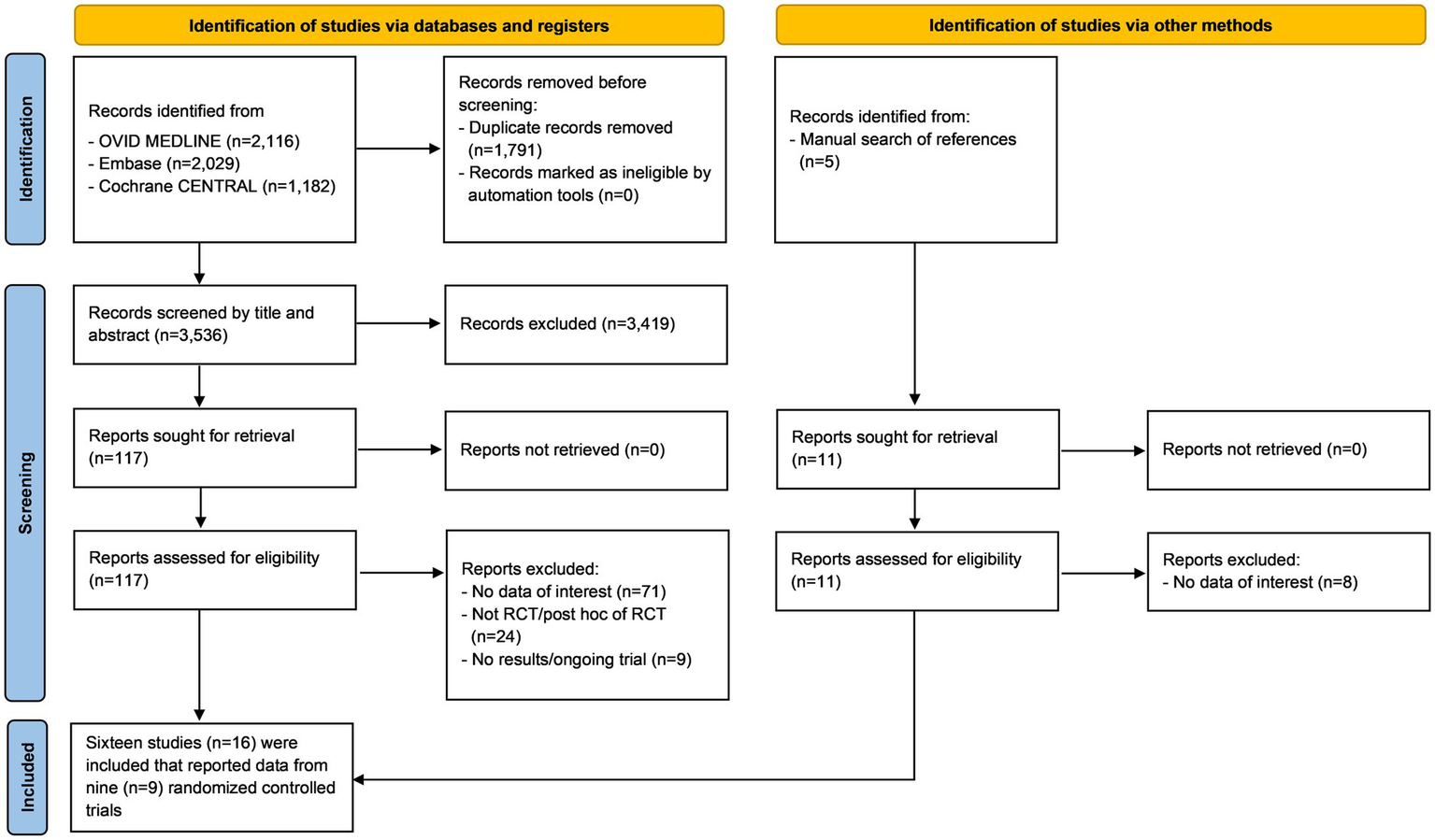 The initial search yielded 5,327 articles from the three online databases. After the removal of duplicates by the two authors who performed the searches (ST, NK), 3,547 records remained for screening by title and abstract, including 11 papers that were identified via a manual search of references. Those same two investigators independently reviewed the full text of 128 publications. Any disagreements between the two reviewing authors were resolved with the help and consultation of a third author (WO). One hundred and twelve articles were excluded for the following reasons: lacked data of interest (n = 79), not an RCT or a post-hoc analysis of an RCT (n = 24), and were ongoing trials or did not publish the results (n = 9). The remaining 16 articles that reported data from 9 recent RCTs were included in this meta-analysis (9, 14, 15, 24–36) (Figure 1) (19). The quality assessment using the RoB 2 tool (37) (The Cochrane Collaboration) is shown in Figure 2. We found no publication bias in study selection using funnel plots as shown in Supplementary Data 3.
