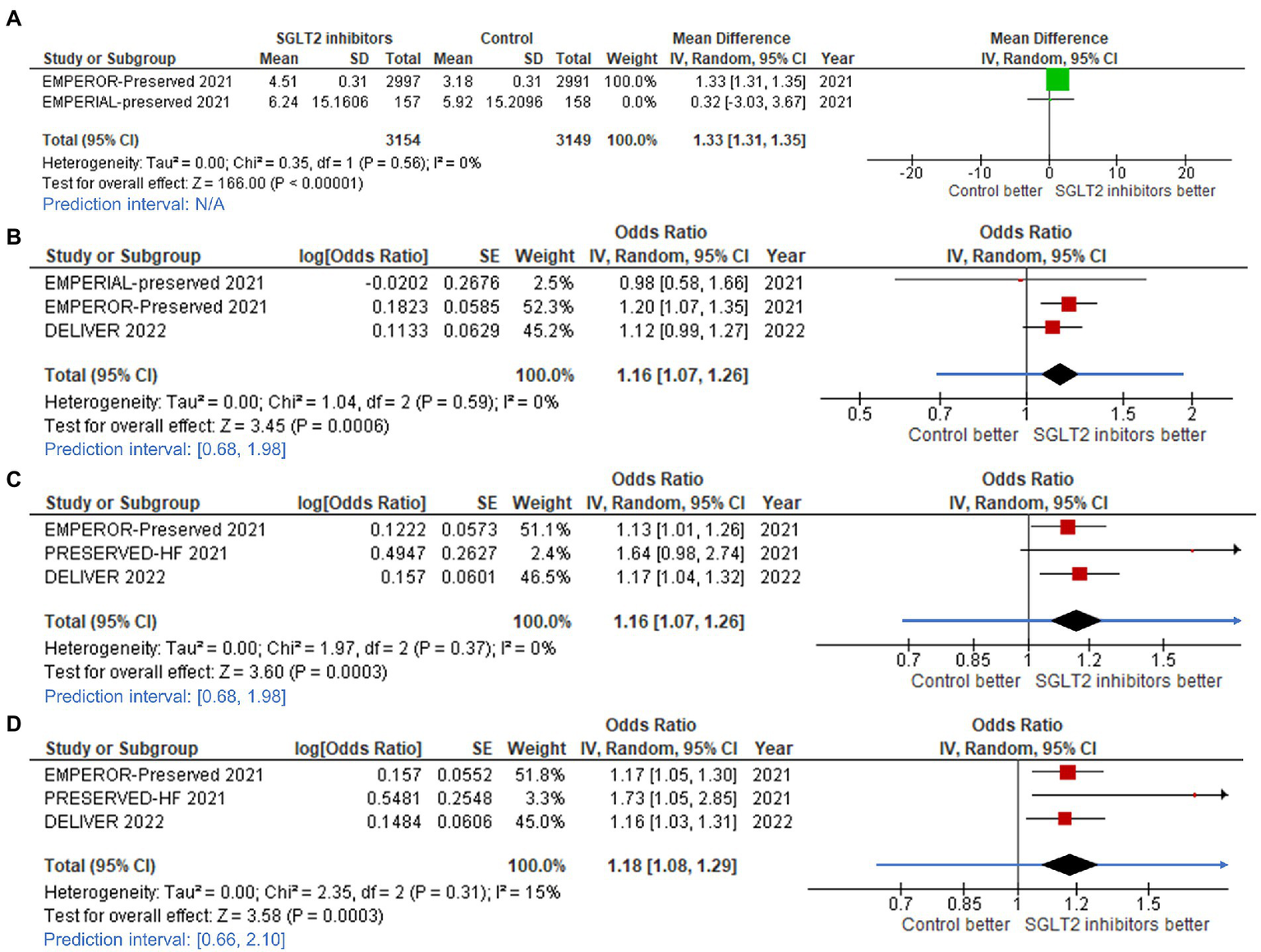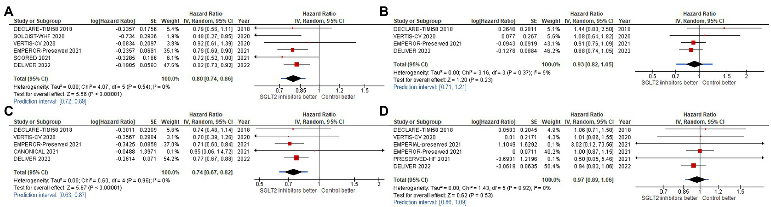 Forest plots of studies that investigated (A) CV death or HHF or urgent visit for heart failure (HF); (B) cardiovascular (CV) death; (C) hospitalization for heart failure (HHF); and, (D) all-cause death compared between patients receiving sodium-glucose cotransporter-2 (SGLT2) inhibitors and controls among all heart failure with mildly reduced (HFmrEF) or preserved ejection fraction (HFpEF) patients.