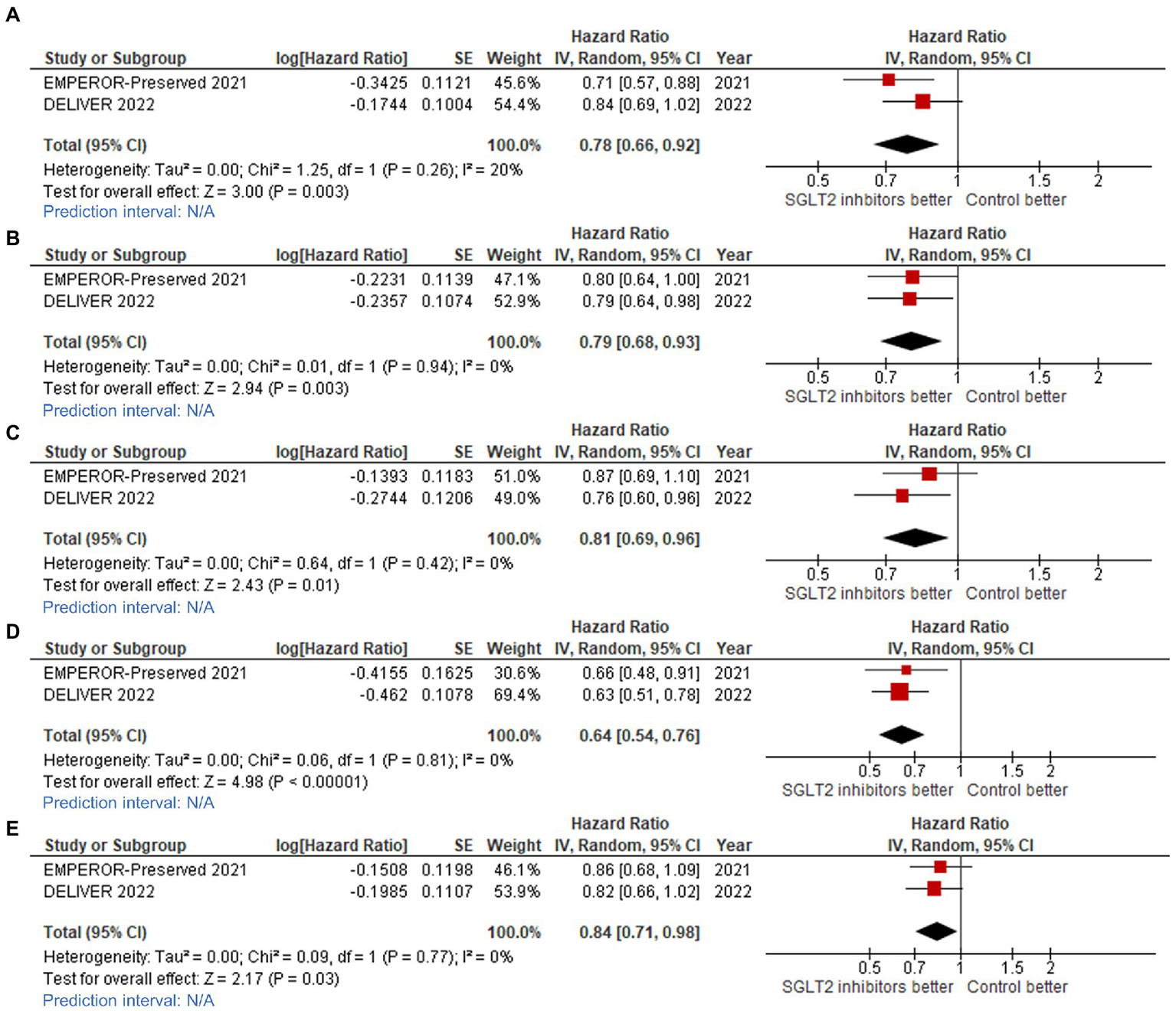 Forest plots of studies that compared patients receiving sodium-glucose cotransporter-2 (SGLT2) inhibitors versus controls among patients with (A) ejection fraction (EF) 40–50% in cardiovascular (CV) death/hospitalization for heart failure (HHF) outcome; (B) EF 50–60% in CV death/HHF outcome; (C) EF >60% in CV death/HHF outcome; (D) EF 50–60% in total HHF outcome; and, (E) EF >60% in total HHF outcome.