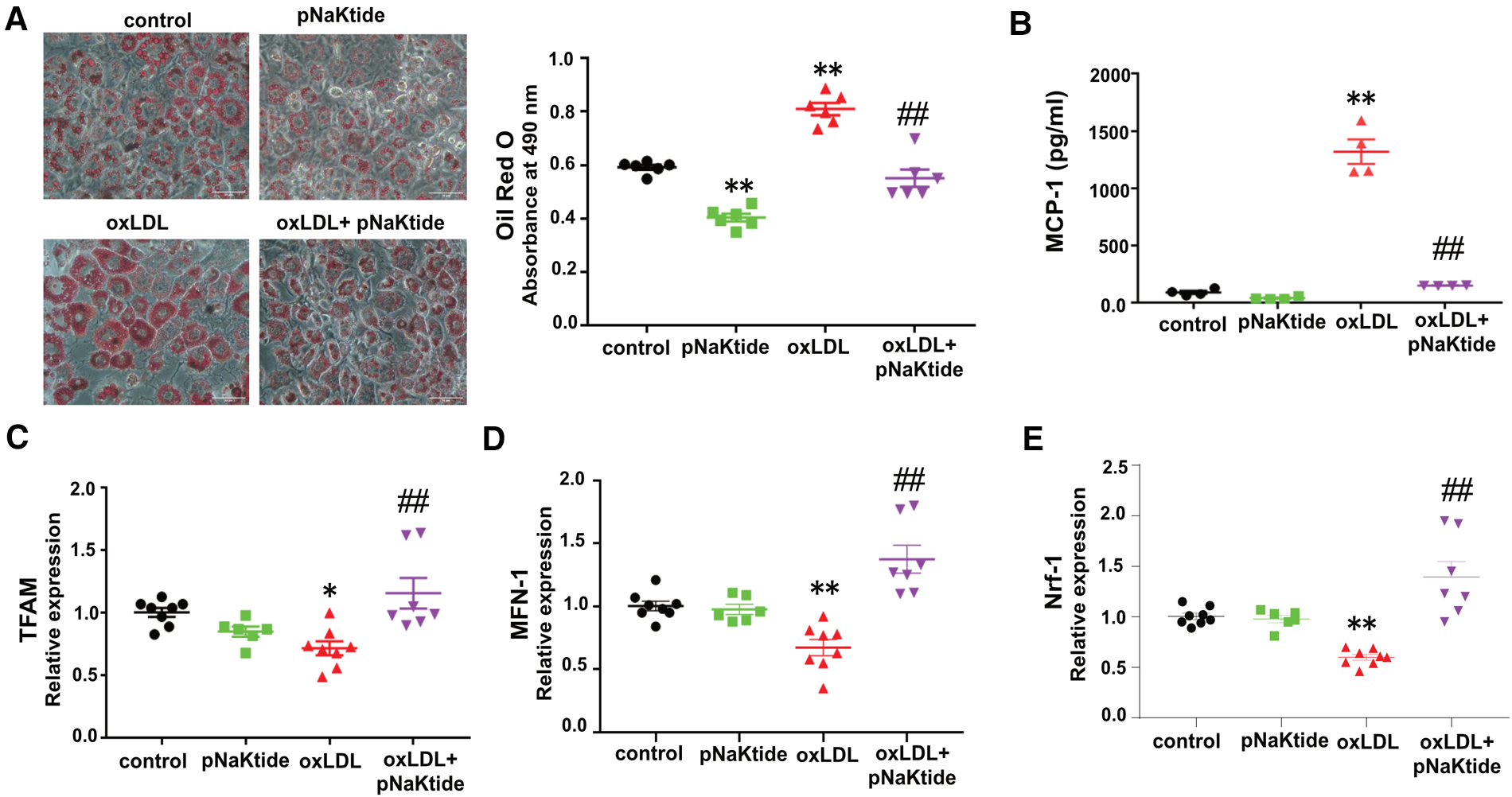 The effect of oxLDL treatment on lipid accumulation, inflammation, and mitochondrial dysfunction in 3T3-L1 murine adipocytes. Differentiated 3T3-L1 adipocytes were treated with 50 μg/ml oxLDL and/or 0.7 μM pNaKtide every 24 h for 2 days. (A) Representative images and quantitative data of lipid accumulation measured as relative absorbance of Oil Red O stain. Images were taken with a 20 × objective lens (n = 6). Scale bar: 50 μm. (B) ELISA for the quantitative analysis of pro-inflammatory cytokine MCP-1 (n = 4). (C–E) RT-PCR analysis for the relative mRNA expressions of TFAM, MFN-1, and Nrf-1 (n = 6–8). Values represent mean ± SEM. * p < 0.05 vs. control, ** p < 0.01 vs. control, ## p < 0.01 vs. oxLDL.