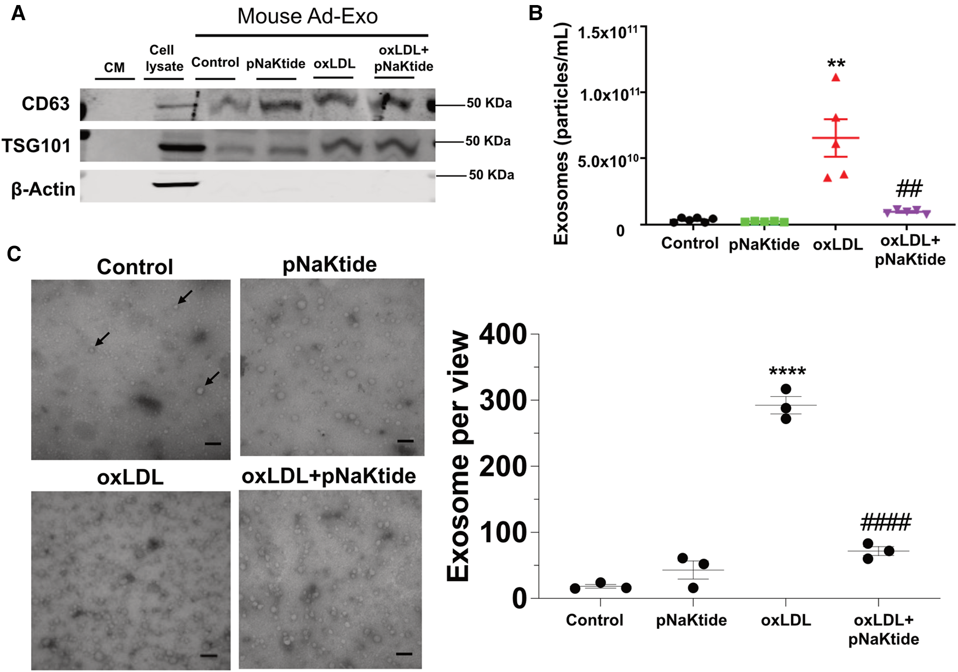 Characterization of the Ad-Exo isolated from 3T3-L1 murine adipocytes. (A) Immunoblot analysis of exosomal positive (CD63 and TSG101) and negative (β-actin) markers (n = 3). (B) NTA for the quantification of exosome particle number (n = 5–6). (C) Transmission electron microscopic images of the isolated exosomes. Black arrows point to the exosomes. Scale bar: 100 nm. The exosome number in each view was counted for each condition and shown in the bar graphs on the right. Values represent mean ± SEM. **p < 0.01, ****p < 0.0001 vs. control; ## p < 0.01, ####p < 0.0001 vs. oxLDL.