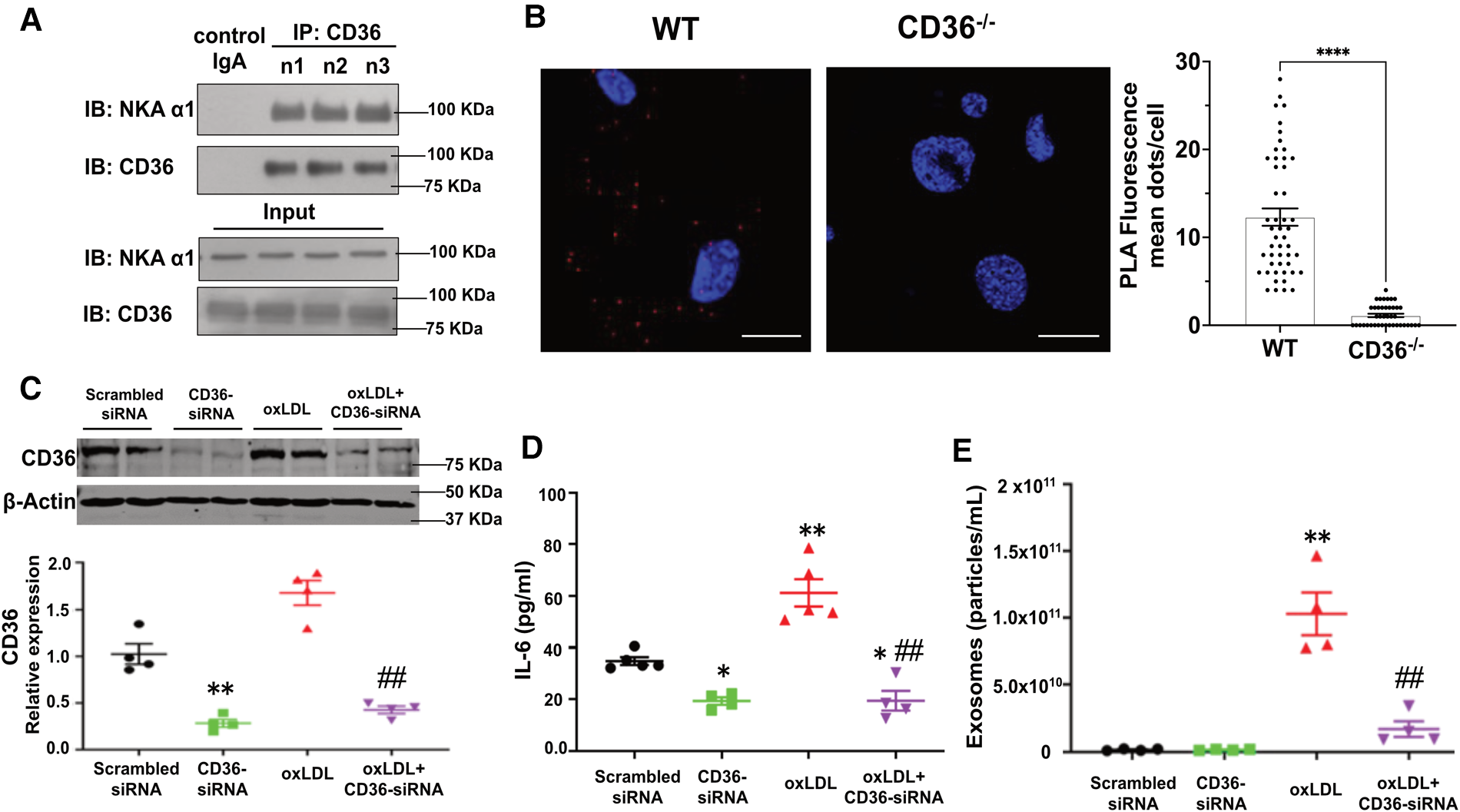 To test whether the CD36/NKA signaling complex exists and functions in adipocytes, we utilized an in vitro murine adipocyte differentiation model using mesenchymal stem cells isolated from mouse external ear tissues (32). Successful adipocyte differentiation was demonstrated by positive Oil Red O staining (Supplementary Material Figure S1A) and upregulation of the adipocyte marker PPARγ (Supplementary Material Figure S1B). Stem cells from CD36 deficient (CD36−/−) mice showed normal adipocyte differentiation as detected by Oil Red O staining, but the differentiated cells had reduced palmitic acid uptake (Supplementary Material Figure S1C), consistent with the known role of CD36 in long-chain fatty acid uptake (25). We immunoprecipitated CD36 from differentiated cells using mouse anti-CD36 IgA followed by immunoblot with anti-NKA α1. NKA α1 co-precipitated with anti-CD36 from adipocyte cell lysates, while an irrelevant mouse IgA precipitated neither CD36 nor NKA α1 (Figure 3A). To confirm, we conducted an in-situ Proximity Ligation Assay (PLA), which demonstrates two proteins in close proximity (<40 nm) to each other (33). Consistently, we observed many positive PLA signals (bright red fluorescent dots) from WT adipocytes but very few from CD36−/− adipocytes, further supporting a direct interaction between CD36 and NKA α1 (Figure 3B). Next, we tested whether CD36 expression was important for Ad-Exo secretion in response to oxLDL by specifically knocking down CD36 expression with siRNA before oxLDL treatment. As expected, CD36 siRNA led to a ∼70% reduction in CD36 expression in adipocytes. While oxLDL upregulated adipocyte CD36, a phenomenon also observed in macrophages (37), CD36 siRNA fully blocked the upregulation effect by oxLDL (Figure 3C). Knocking down adipocyte CD36 significantly also reduced oxLDL-stimulated IL-6 secretion (Figure 3D) and exosome secretion (Figure 3E). These results indicate an indispensable role of adipocyte CD36 in pro-inflammatory response and exosome secretion induced by oxLDL.