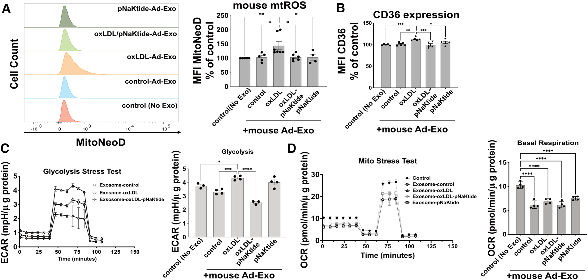 oxLDL-Ad-Exo promote pro-atherogenic phenotypes in macrophages. Ad-Exo were isolated from a conditioned medium of 3T3-L1 adipocytes subjected to 50 μg/ml oxLDL and/or 0.7 μM pNaKtide every 24 h for 2 days. For each condition, 1 ml of the conditioned medium was collected and Ad-Exo were isolated. Then isolated Ad-Exo were dissolved in a macrophage culture medium and incubated with WT murine peritoneal macrophages for 24 h. (A) Macrophage mtROS were assayed by MitoNeoD and signals were quantified by mean fluorescence intensity (MFI) of flow cytometry results. Histograms of different treatments are shown on the left and MFI bar graphs are shown on the right (n = 4–7). (B) Macrophage surface CD36 levels were quantified by MFI of flow cytometry results and are shown in the bar graphs (n = 5). (C) Glycolytic stress tests were conducted on treated macrophages. ECAR curves are shown on the left and maximum ECAR values are shown in the bar graphs on the right (n = 4). (D) Mito stress tests were conducted on treated macrophages. OCR curves are shown on the left and basal respiration values are shown in the bar graphs on the right (n = 4). Values represent mean ± SEM. *p < 0.05, **p < 0.01, ***p < 0.001, ****p < 0.0001.