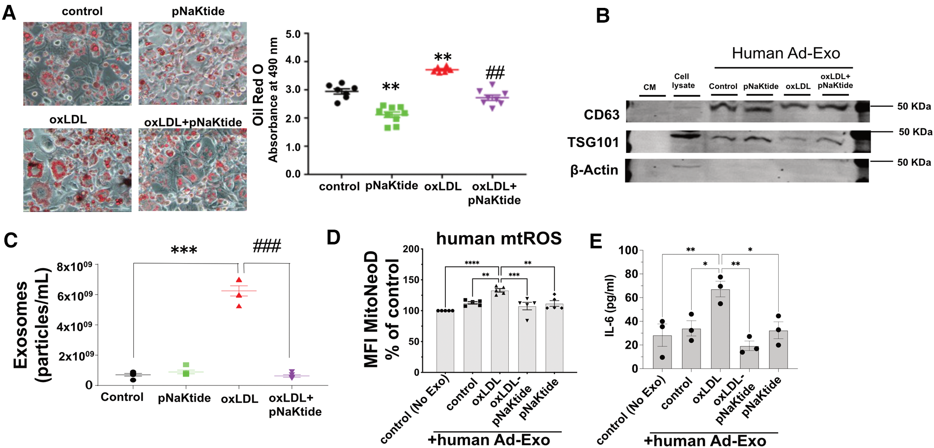 For 3T3-L1 cell differentiation, frozen mouse pre-adipocytes (3T3-L1) were purchased from ATCC. After thawing, cells were suspended in Dulbecco's Modified Eagle Medium supplemented with 10% heat-inactivated fetal bovine serum and 1% antibiotic/antimycotic solution (Invitrogen, Carlsbad, CA, USA) and maintained at 37 °C in a 5% CO2 incubator. Upon attaining 60%–70% confluence, the medium was replaced with adipogenic medium (iXCells Biotechnologies, San Diego, CA, USA), and the cells were cultured in 6-well plates for an additional seven days. The cells were treated with pNaKtide (0.7 µM) and oxLDL (50µg/ml) on day 5 and day 6. On day 7, the conditioned medium was collected for exosome extraction and cytokine assays. The cells were harvested and solubilized in RPA buffer for RNA isolation.