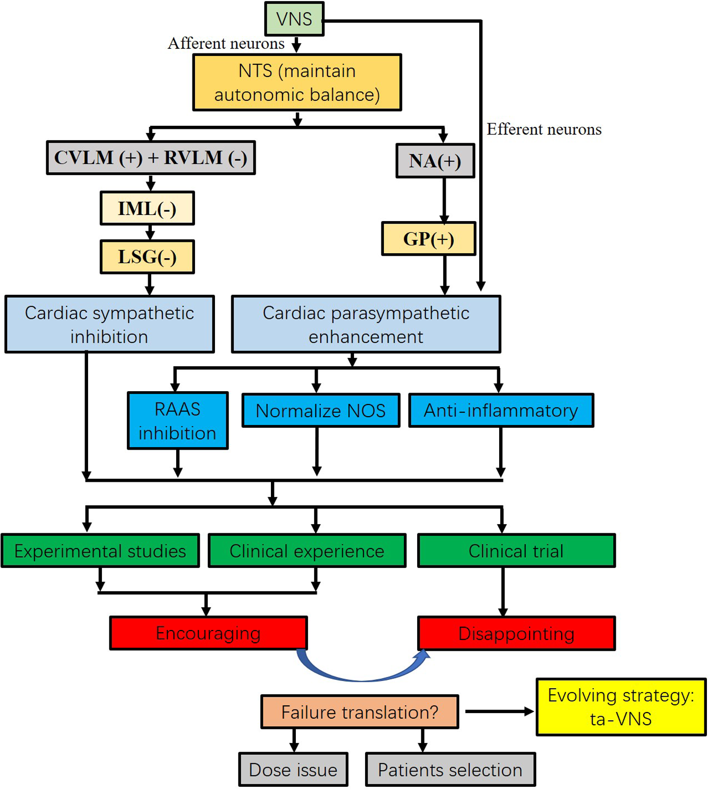 Flow chart of VNS on heart failure from concept to translation. VNS maintains autonomic balance. VNS significantly inhibits sympathetic nervous activity and enhances vagal tone. Increased vagal activity attenuates heart failure by RAAS inhibition, NOS normalization, and anti-inflammatory response. The results from the experimental studies and clinical experiences are encouraging. However, the results from recent clinical trials did not achieve the same benefit as experimental studies. Several reasons may contribute to the translation, including dose issues and patient selection. Instead of electrical VNS, tragus nerve stimulation is an evolving strategy. CVLM, caudal ventrolateral medulla; GP, ganglion plexus; IML, intermediolateral cell column; LSG, left stellate ganglion; Ta-VNS opens an era in the treatment of heart failure. NOS, nitric oxide synthase; NTS, nucleus of the solitary tract; RAAS, renin-angiotensin-aldosterone system; RVLM, rostroventrolateral medulla; ta-VNS, tragus nerve stimulation; VNS, vagus nerve stimulation.
