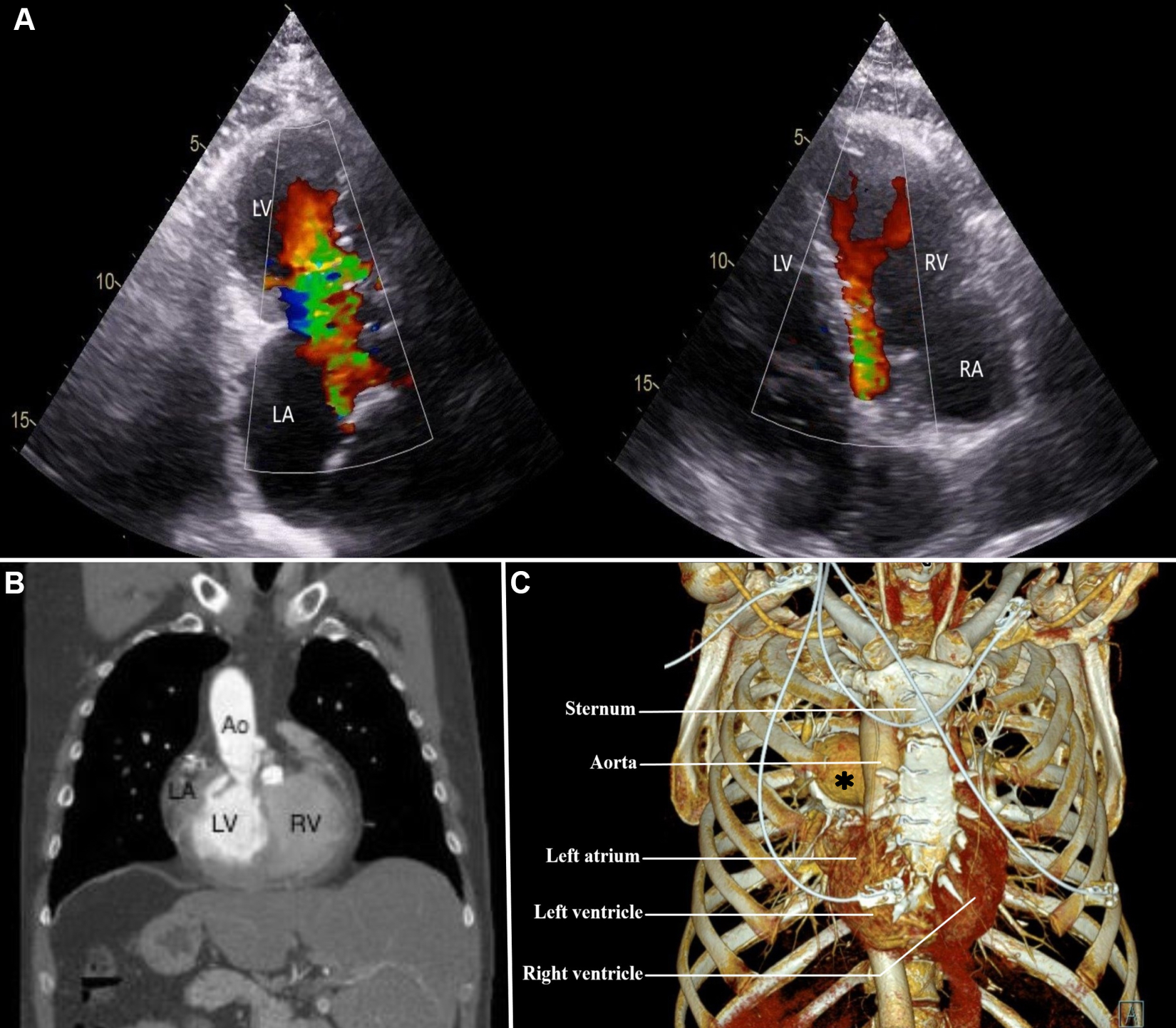 (A) preoperative transesophageal echocardiography showing mitral and pulmonary valve regurgitation; (B) computed tomography angiography of the chest and upper abdomen, demonstrating a rightward orientation of the left atrium, and liver at the left side; (C) computed tomography angiography with 3D reconstruction of the chest, illustrating a right-sided location of the left atrium and ventricle from the sternum. Ao, aorta; LA, left atrium; LV, left ventricle; RA, right atrium; RV, right ventricle. Asterisk, right pulmonary artery.