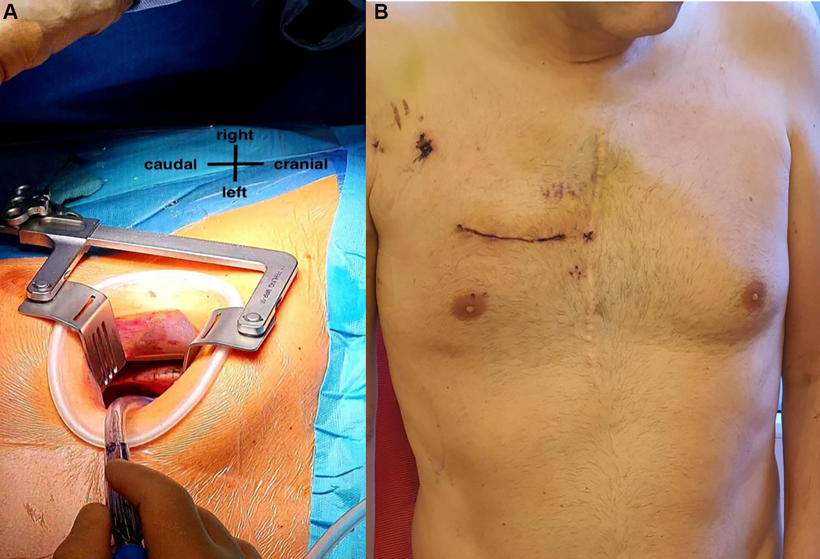 (A) right anterior mini-thoracotomy through a 5 cm skin incision at the fourth right intercostal space. (B) The patient at 6th postoperative day with the minimal incision right.