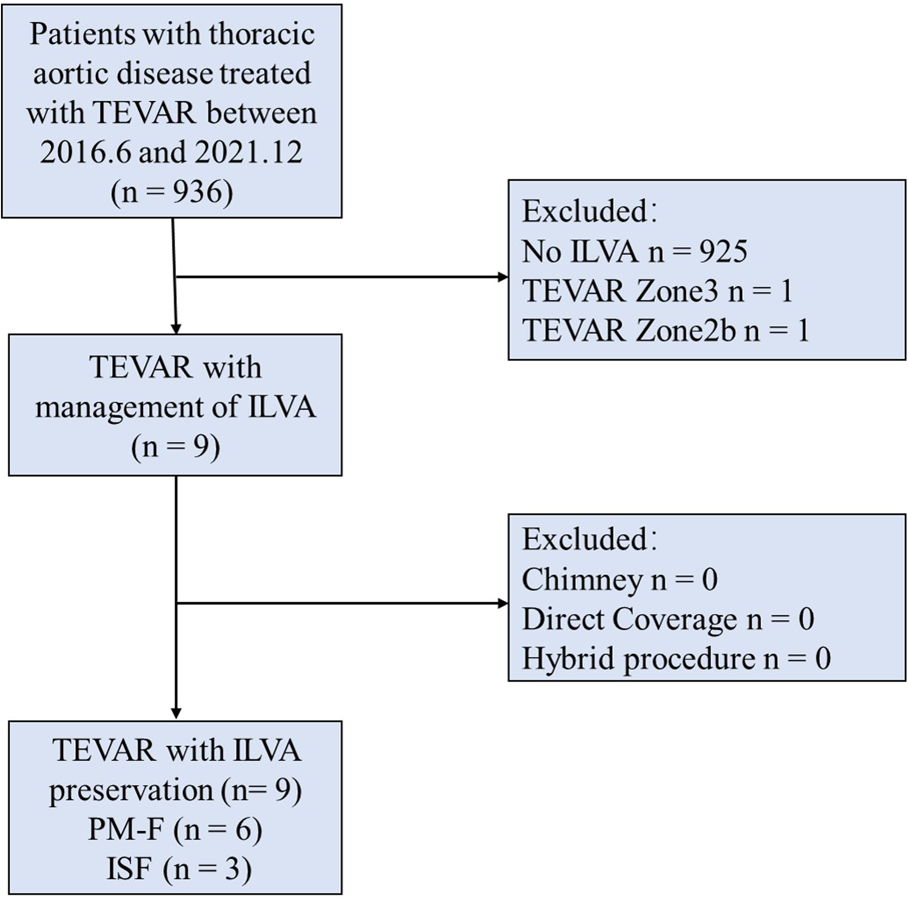 Exclusion criteria were as follows: (1) Patients without ILVA; (2) Patients treated with open surgery or hybrid procedure; (3) Patients underwent endovascular repair without ILVA reconstruction (Zone 3 TEVAR or Zone 2b TEVAR or direct coverage); (4) ILVAs were reconstructed with other endovascular technique such as parallel stents.
