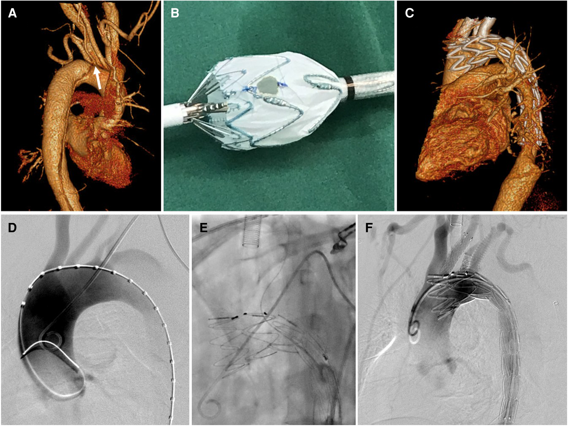 Physician modified-fenestration for isolated left vertebral artery. (A) Preoperative CTA of a type B aortic dissection demonstrating the ILVA (white arrow) from the distal aortic arch between the LCCA and the LSA; (B) A fenestration was made on the main body stent graft for preservation of ILVA on table; (C) follow up CTA showed patent target vessels and well excluded aortic dissection without endoleak; (D) intraoperative aortography showed a type B aortic dissection with a ILVA; (E) After full deployment of the stent graft, the ILVA was super-selected from the contralateral femoral access followed by bridging stent implantation; (F) Final aortography demonstrated complete exclusion of aortic dissection and patent aortic arch branch arteries, with bridging stent-grafts in the LCCA, ILVA, and LSA.