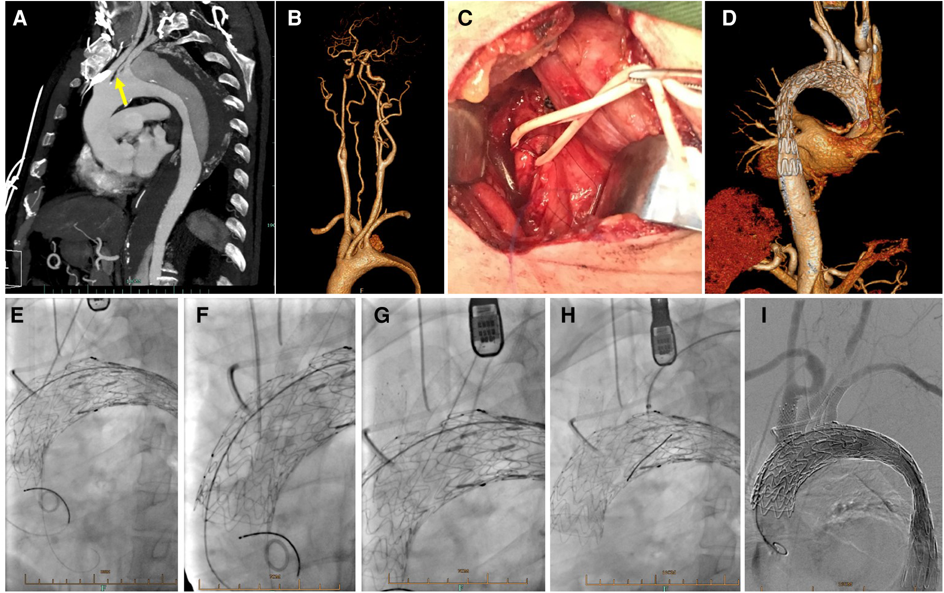 In situ fenestration for isolated left vertebral artery. (A) Preoperative CTA showed a type B aortic dissection with ILVA (yellow arrow); (B) The cervicle contrast-enhanced CTA demonstrated dominant ILVA and incomplete circle of Willis; (C) During procedure, the ILVA was exposed with a supraclavicular incision; (D) Follow up CTA showed well exclusion of aortic dissection and patent supra aortic branches; Needle-assisted in situ fenestration followed by bridging stents placement for reconstruction of LCCA (E), BCT (F), ILVA (G) and LSA (H) after deployment of stent graft; (I) Complete aortography demonstrated excluded aortic dissection and patent branch vessels.