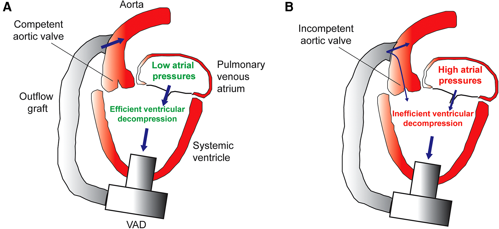 (A) Efficient decompression of the systemic ventricle and pulmonary venous atrium in the setting of a competent aortic valve. (B) Inefficient VAD support caused by aortic insufficiency leads to incomplete ventricle decompression, high atrial pressures, pulmonary venous congestion, and heart failure symptoms.