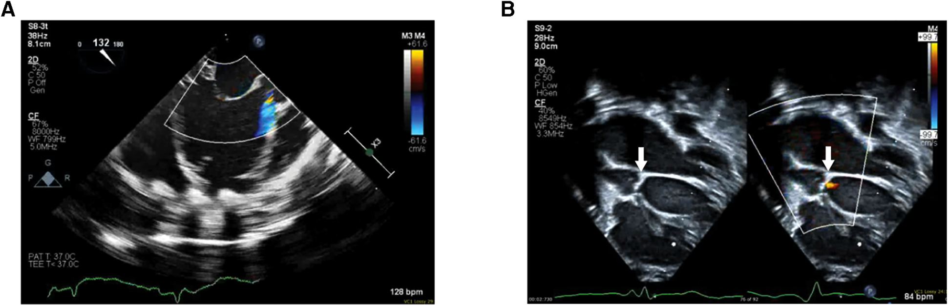 (A) Pre-VAD implantation echocardiogram with color doppler mapping demonstrating significant AI. (B) Post-VAD implantation 2D echocardiogram (left) with color-doppler comparison (right) demonstrating the patch placed at the ventriculoaortic junction (white arrows) and trivial patch margin leak.