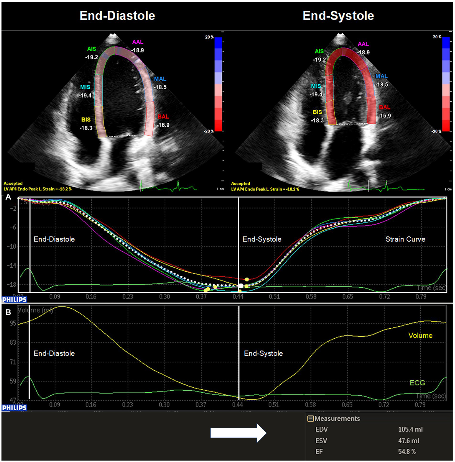 Two-dimensional speckle tracking echocardiography of the left ventricle. The image was acquired through echocardiography in apical four chamber view and transferred to an offline workstation (QLAB cardiovascular ultrasound quantification software, version 11.1, Philips Healthcare, The Netherlands) for further analysis. In end-diastole (QRS in ECG) the investigator marked the endocardium at three fixed points. The endocardium was then automatically marked at end-diastole by the software. The investigator could manually adjust the region of interest at end-diastole and at end-systole (end of T-wave in ECG) if necessary. (A) Global peak longitudinal strain for apical four chamber view (GPLS_A4C, %) was then automatically assessed by the software at end-systole. (B) In addition, a left ventricular volume curve was generated enabling the calculation of left ventricular end-diastolic volume (EDV, mL), left ventricular end-systolic volume (ESV, mL), and left ventricular ejection fraction (EF, %).