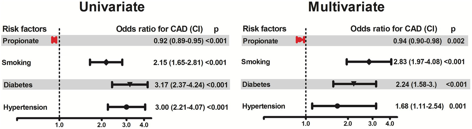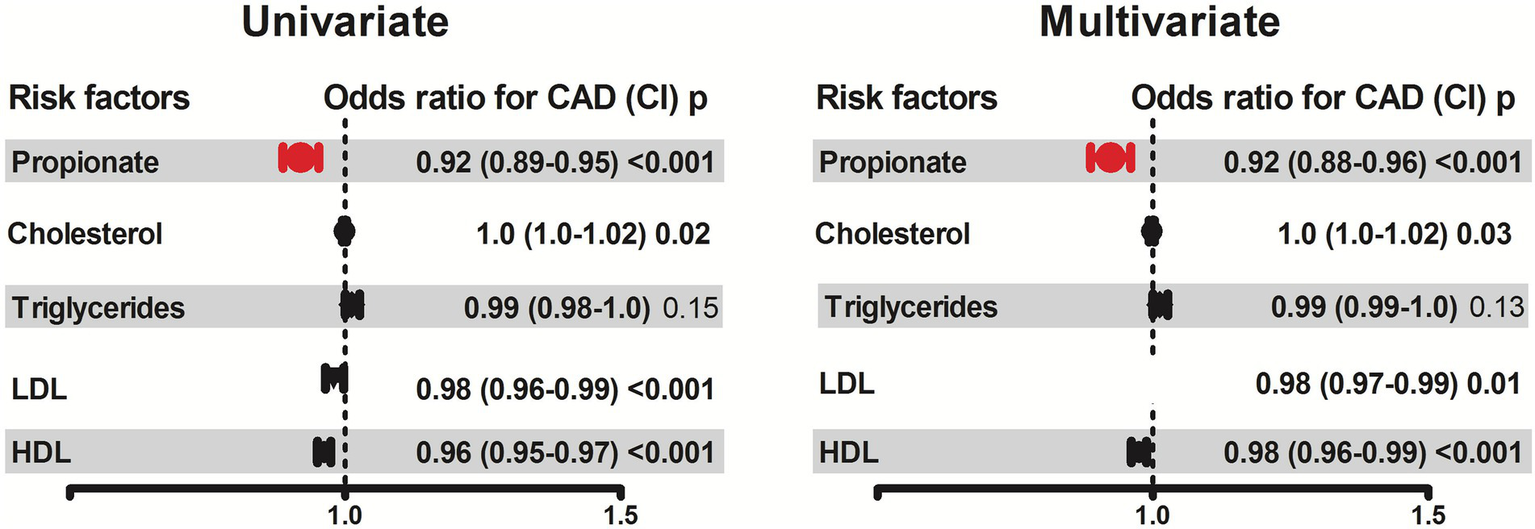Association of propionate concentrations with the presence of coronary artery disease (CAD). The association of propionate with CAD was assessed by logistic regression using univariate and multivariate models adjusted for the major lipid parameters (HDL, LDL, Cholesterol, Triglycerides) in addition to age, gender, hypertension, diabetes and smoking. Odds ratios and 95% confidence intervals are presented. Odds ratios for continuous variables are per 1-SD increase.