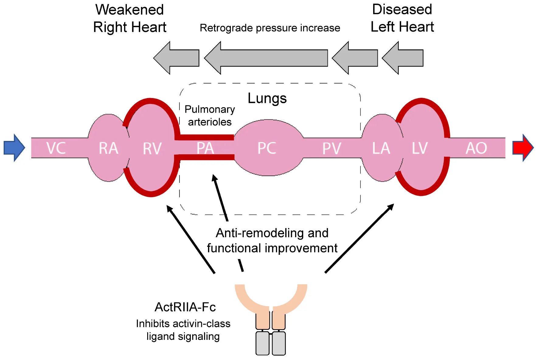 In Group 2 pulmonary hypertension (PH), left heart failure can cause retrograde elevation of blood pressure that leads to dysfunction of the pulmonary arterial system and subsequent right heart failure. Activin receptor type IIA-Fc fusion protein (ActRIIA-Fc) improves cardiopulmonary remodeling and function in models of Group 2 PH through mutually reinforcing, beneficial actions at multiple sites.