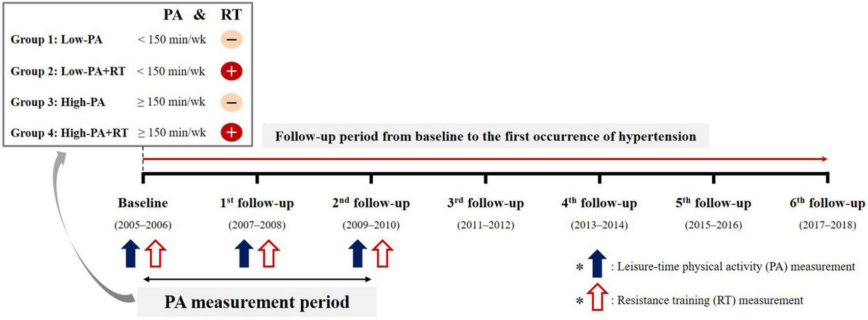RT was defined as any training program which involves muscle contraction against external resistance using body weight, weight machines, dumbbells, and barbells. For regularity of RT, the frequency (per week) and training period (months) of the most recent evaluation during the PA measurement period were assessed. However, to examine the cause-and-effect associations between RT and hypertension, if hypertension occurred during the PA measurement period, the most recent evaluation before the onset of hypertension was used. Regular RT was considered as participation in an RT program for more than 1 day per week. Participants were assigned to one of four subgroups based on RT regularity and leisure-time PA levels as follows: “Low-PA,” “Low-PA+RT,” “High-PA,” and “High-PA+RT.”