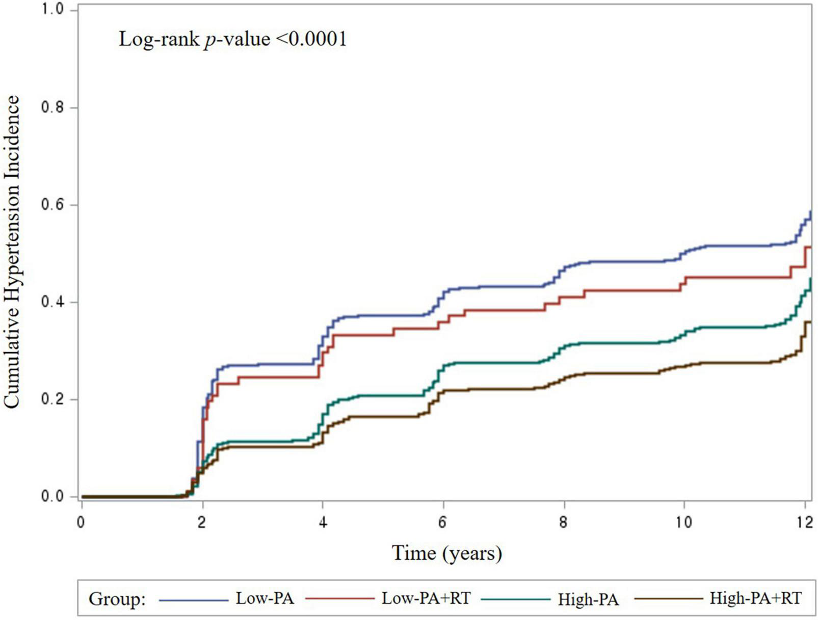 The additional effect of RT on hypertension among participants with low or high leisure-time PA levels was further investigated. The proportion of male and female participants who engaged in RT was 12.01 and 8.14%, respectively. The participants were divided into four subgroups based on leisure-time PA levels and RT. As shown in Figure 2, the Low-PA group exhibited the highest cumulative incidence rate of hypertension (log-rank p < 0.0001). RT showed no significant impact in the Low-PA group with regard to hypertension (Table 3). However, compared to the Low-PA group, the High-PA, and High-PA+RT groups had 30 and 39% lower risks for hypertension, respectively (all p < 0.0001; p for trend <0.0001). These associations remained significant, even after stratifying the participants by sex. Among men, the High-PA+RT group had a markedly higher training frequency (p < 0.0001) and a higher rate of long-term RT program (≥1 year; p < 0.01) than the Low-PA+RT group. Among women, the High-PA+RT group had a significantly higher training frequency (p < 0.01), a longer RT period (p < 0.05), and a higher rate of long-term RT program (≥1 year; p < 0.0001) than the Low-PA+RT group. The baseline characteristics of the four subgroups are shown in Supplementary Table 2.