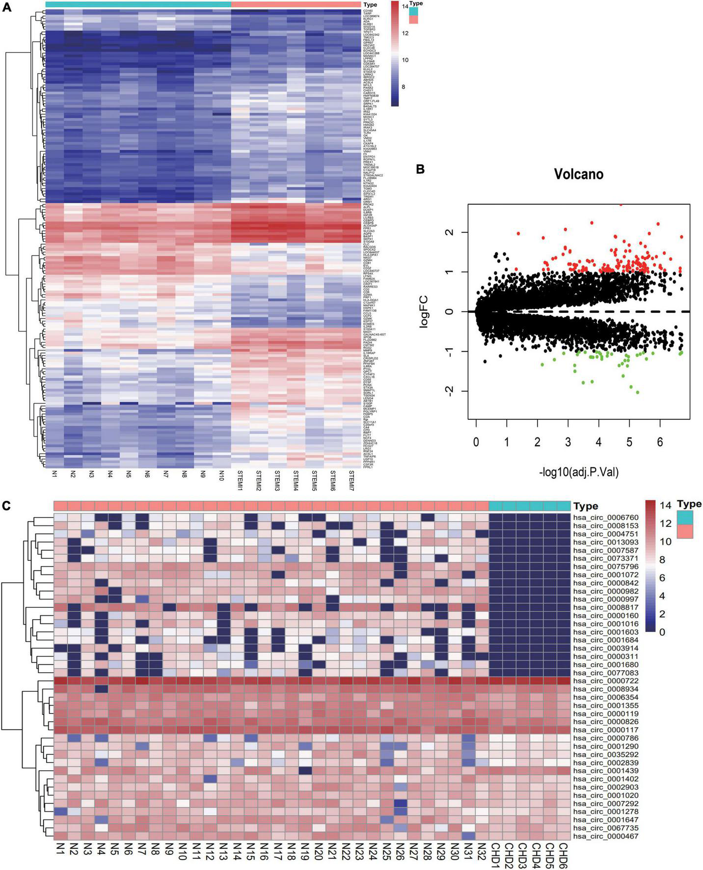 Distribution of differentially expressed genes. (A) Heat maps of differentially expressed genes in plasma derived from patients with acute myocardial infarction were divided into acute myocardial infarction (ACS) group (7 cases) and healthy control group (10 cases). Blue to red successively represent gene expression levels from low to high. (B) Volcano map of ACS differentially expressed genes. (C) Heat maps of differentially expressed circRNA genes in patients with CHD derived from exosomes were divided into CHD group (6 cases) and healthy control group (32 cases). Blue to red represent gene expression from low to high.