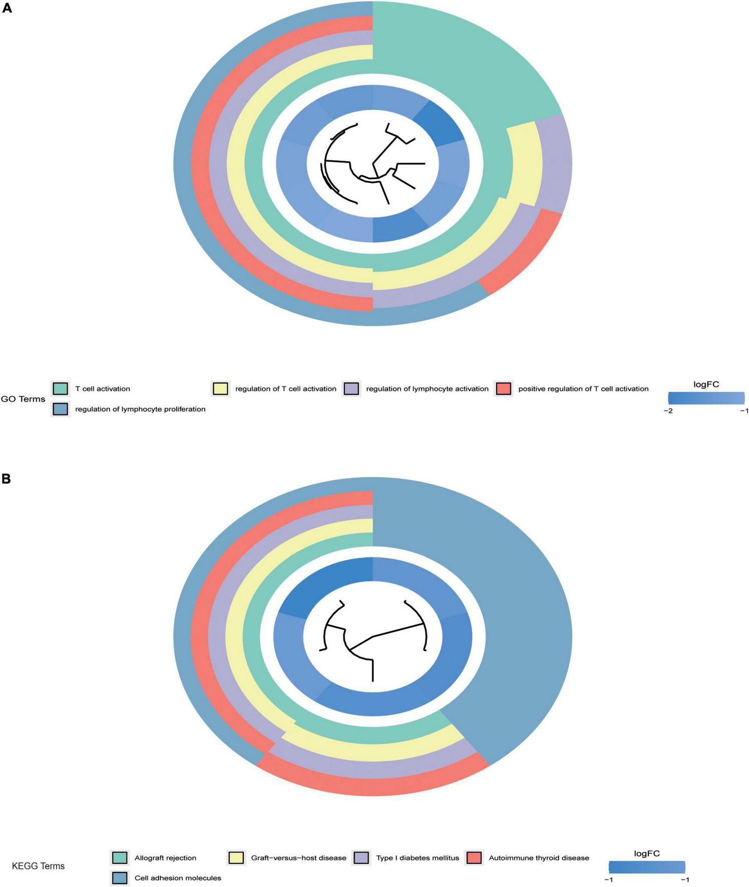 To further detect the potential function of differentially expressed mRNAs in acute myocardial infarction in CHD, we performed the GO term and KEGG pathway functional enrichment analyses. The GO term enrichment analysis showed that exosomal mRNAs were mainly enriched in T cell activation, regulation of T cell activation, regulation of lymphocyte activation, positive regulation of T cell activation, and regulation of lymphocyte proliferation (Figure 2). The KEGG pathway enrichment analysis showed that the differentially expressed mRNAs in the regulatory network are mainly enriched in Allograft rejection, Graft-versus-host disease, Type I diabetes mellitus, Epicardial thyroid disease, and Cell adhesion molecules. Studies have shown that CHD is correlated with cell adhesion molecules (32, 33). These results suggest that the differentially expressed circRNAs may play an important role in the occurrence and development of CHD.