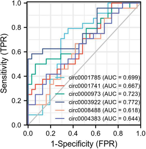 Receiver operator characteristic (ROC) curve of circRNA for the diagnosis of coronary heart disease (CHD). As shown in the figure, each point on the curve corresponds to the FPR and TPR at different thresholds. TPRate refers to the proportion of all samples of true category 1 that are predicted to be in category 1. FPRate refers to the percentage of all samples with true category 0 that are predicted to be in category 1. AUC refers to the random selection of a positive sample and a negative sample from a given category. The classifier predicted that the probability of a positive sample being positive was P1 and that of a negative sample being positive was P2. AUC is the probability that P1 > P2.