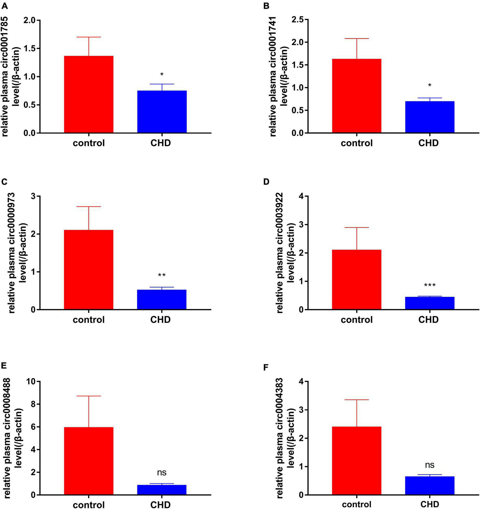 qRT-PCR results of peripheral blood-derived circRNA. The expressions of peripheral blood-derived circRNAs were further confirmed using qRT-PCR. (A) Represents the expression of circ0001785 in white blood cells of healthy and coronary patients, (B) represents the expression of circ0001741 in white blood cells of healthy and coronary patients, (C) represents the expression of circ0000973 in white blood cells of healthy and coronary patients, (D) represents the expression of circ0003922 in white blood cells of healthy and coronary patients, (E) represents the expression of circ0008488 in white blood cells of healthy and coronary patients, and (F) represents the expression of circ0004383 in white blood cells of healthy and coronary patients. Red represents healthy control group, blue represents coronary heart disease (CHD) group, P < 0.05 was statistically significant. *P < 0.05, **P < 0.01, and ***P < 0.001.